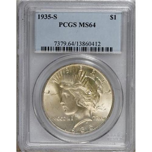 <!-- BEGIN: ICOLLECTOR - EBAY LOT HTML CODE --><style type='text/css'> #icoll_images_thumbnails, #icoll_images_mainimage, #icoll_otherlots { display: none; } div { font-family: arial, verdana, helvetica; } img { border: none; } .icoll_heading_title { background-color: #EFEFFF; color: #000; font-family: arial, verdana, helvetica; font-size: 12pt; font-style: normal; font-weight: bold; } </style><style type='text/css'>@import url(http://www.icollector.com/css/ebay/ebaylot_20070703.css);</style><script language='javascript' type='text/javascript'>function icollfunc_getelement(element_id) { var tmpelement = null; if(document.getElementById) tmpelement = document.getElementById(element_id); if(tmpelement == null) tmpelement = document[element_id]; return tmpelement; }var icollvar_mainpic = null; function icollfunc_initimages() { icollfunc_getelement('mainPicture').style.display = 'none'; icollvar_mainpic = icollfunc_getelement('icoll_images_mainimage'); var body_onload = document.body.attributes['onload']; document.body.setAttribute('onload', (body_onload ? body_onload.nodeValue : '') + 'icollfunc_fixoperaimgbug();'); }function icollfunc_changeimage(imgurl) { if(icollvar_mainpic != null) icollvar_mainpic.src = imgurl; }function icollfunc_fixoperaimgbug() { if(window.opera) { var imgobjs = icollfunc_getelement('icoll_images_thumbnails').getElementsByTagName('img'); for(var i=0; i<imgobjs.length; i++) { var w = imgobjs[i].clientWidth; if(w > 0) imgobjs[i].style.width = w + 'px'; } } }</script><script language='javascript' type='text/javascript'> var useragent = escape(navigator.userAgent); var appname = escape(navigator.appName); var dateobj = new Date(); var datetime = escape(dateobj.getFullYear()+'-'+(dateobj.getMonth()+1)+'-'+dateobj.getDate()+' '+dateobj.getHours()+':'+dateobj.getMinutes()); var referrer = ''; if(document.referrer && document.referrer != null) referrer = escape(document.referrer); new Image().src = 'http://www.icollector.com/stats/ebaylot.ashx?id=7140535&ua='+useragent+'&an='+appname+'&dt='+datetime+'&tz='+dateobj.getTimezoneOffset()+'&re='+referrer;</script><div id='icoll_images'><div id='icoll_images_prev'><a href='http://cgi.liveauctions.ebay.com/ws/eBayISAPI.dll?ViewItem&item=170135059795'><img src='http://www.ha.com/common/proxyImage.php?ebay=445-122005-1-75' alt='' /><img src='http://icollector.com/graphics/ebay_leftarrow.gif' alt='' class='arrow' /></a><div id='icoll_images_prev_info'>Prev Lot</div></div><div id='icoll_images_next'><a href='http://cgi.liveauctions.ebay.com/ws/eBayISAPI.dll?ViewItem&item=170135059806'><img src='http://www.ha.com/common/proxyImage.php?ebay=445-122007-1-75' alt='' /><img src='http://icollector.com/graphics/ebay_rightarrow.gif' alt='' class='arrow' /></a><div id='icoll_images_next_info'>Next Lot</div></div><div id='icoll_images_thumbnails'><a href='http://www.ha.com/common/proxyImage.php?ebay=445-1146-1-75' target='_blank' onmouseover="icollfunc_changeimage('http://www.ha.com/common/proxyImage.php?ebay=445-1146-1-75');"><img src='http://www.ha.com/common/proxyImage.php?ebay=445-1146-1-75' alt='' /></a><a href='http://www.ha.com/common/proxyImage.php?ebay=445-1146-2-75' target='_blank' onmouseover="icollfunc_changeimage('http://www.ha.com/common/proxyImage.php?ebay=445-1146-2-75');"><img src='http://www.ha.com/common/proxyImage.php?ebay=445-1146-2-75' alt='' /></a><div id='icoll_images_thumbnails_info'>Hover thumbnail to view large image below. Click thumbnail to view full image in new window.</div></div><div id='icoll_images_mainimage_container'><img id='icoll_images_mainimage' alt='' src='http://www.ha.com/common/proxyImage.php?ebay=445-1146-1-75'></div></div><script language='javascript' type='text/javascript'>icollfunc_initimages();</script><div id='icoll_description'><B>1935-S $1 MS64 PCGS.</B></I> PCGS Population (1096/581). NGC Census: (754/380). Mintage: 1,964,000. Numismedia Wsl. Price for NGC/PCGS coin in MS64: $520. (#7379)<BR><BR><B>Coin Engraver:</B> Anthony de Francisci<BR><BR><b>Shipping:</b> Coins & Currency (<a target="_blank" href="http://www.heritageauctions.com/common/shipping.php">view shipping information</a>\)</div><div id='icoll_notices'><div class='icoll_heading_left'></div><div class='icoll_heading'><div class='icoll_heading_title'>Notices</div></div><div class='icoll_heading_right'></div><div id='icoll_notices_info'><B>Important notice:</B> Heritage usually auctions material at the rate of 200-250 lots per hour. On some occasions eBay Live bid software or the Internet may not be able to keep up with the pace of the auction. We recommend placing a realistic absentee bid now as insurance to avoid disappointment. Occasionally the auctioneer may eliminate or reject an eBay Live bid, and the auctioneer may also reopen a lot after the close of the eBay live bidding (usually because we missed an audience bid), and may reject your bid even if it shows you as the winning bidder. By bidding via eBay Live, you agree that Heritage may award the lot to another bidder at its sole discretion under the circumstances described above or any other reasonable circumstances. Since eBay bids are not shown to us until we open the lot on the floor, we treat those bids just like floor bids. In most cases the floor responds before the eBay bid is presented to us, due to Internet lag time, so for consistency we have made it a policy that floor bids are always considered first over tie eBay live bids. Also please note that all Heritage lots purchased through eBay Live carry a 20% Buyer's Premium with a $9 minimum Buyer's Premium. Please make sure you read the Terms and Conditions before you bid. This lot is being auctioned in conjunction with a live floor auction by Heritage Auctions. All final auction and invoice information will be supplied by Heritage Auctions, and all other information should be considered preliminary. <BR><BR><B>Winning Notification and Billing:</B> After the FINAL session in this auction is complete, Heritage will se