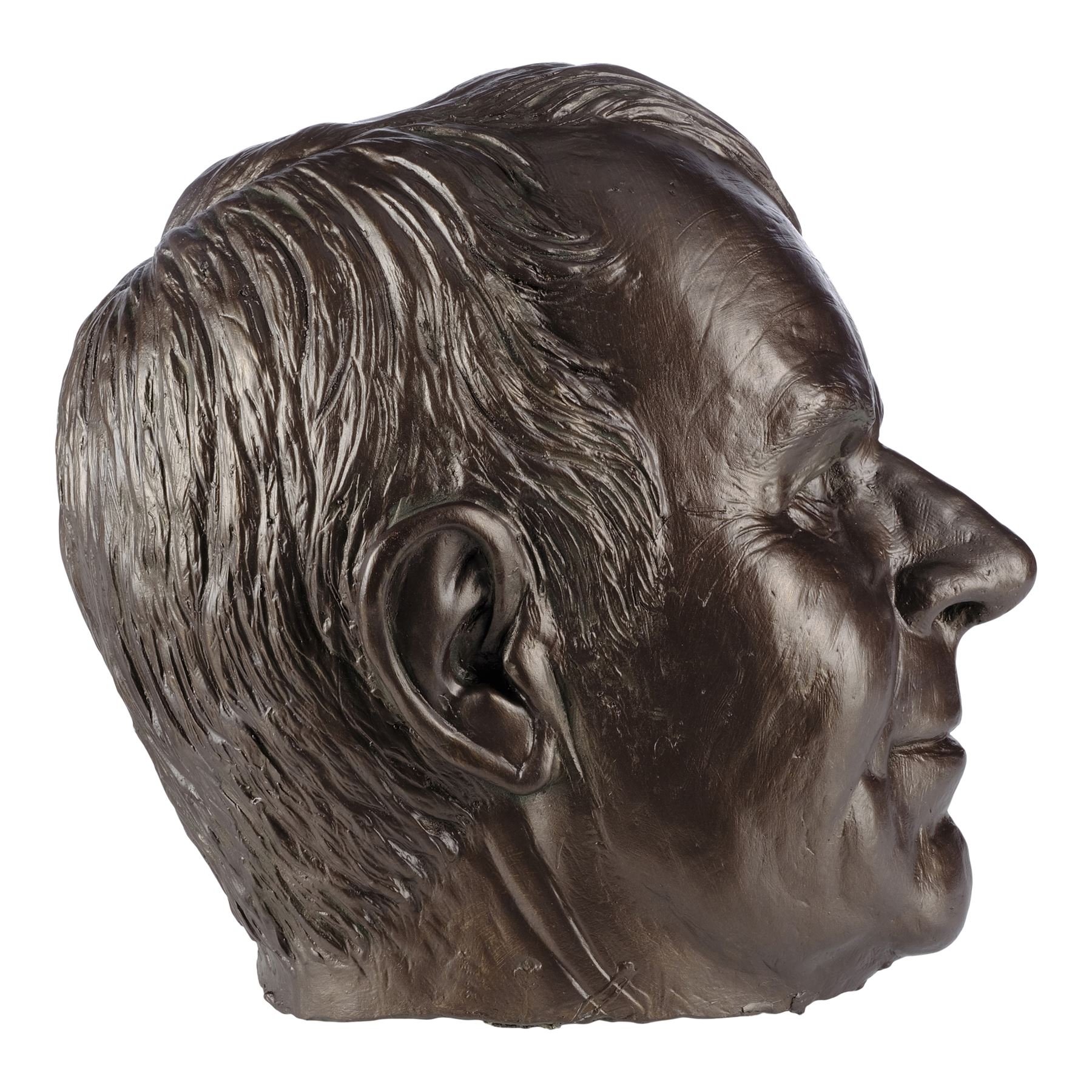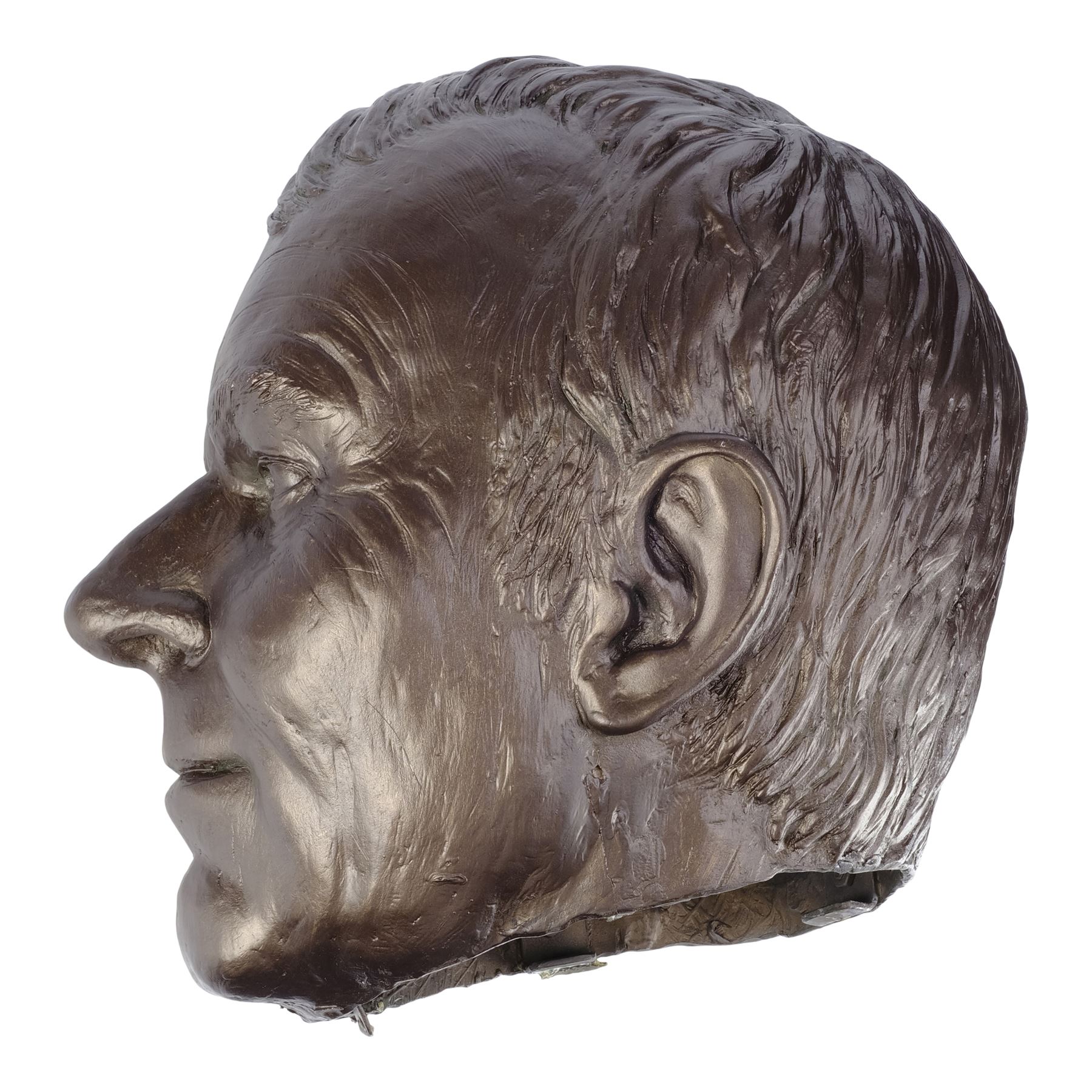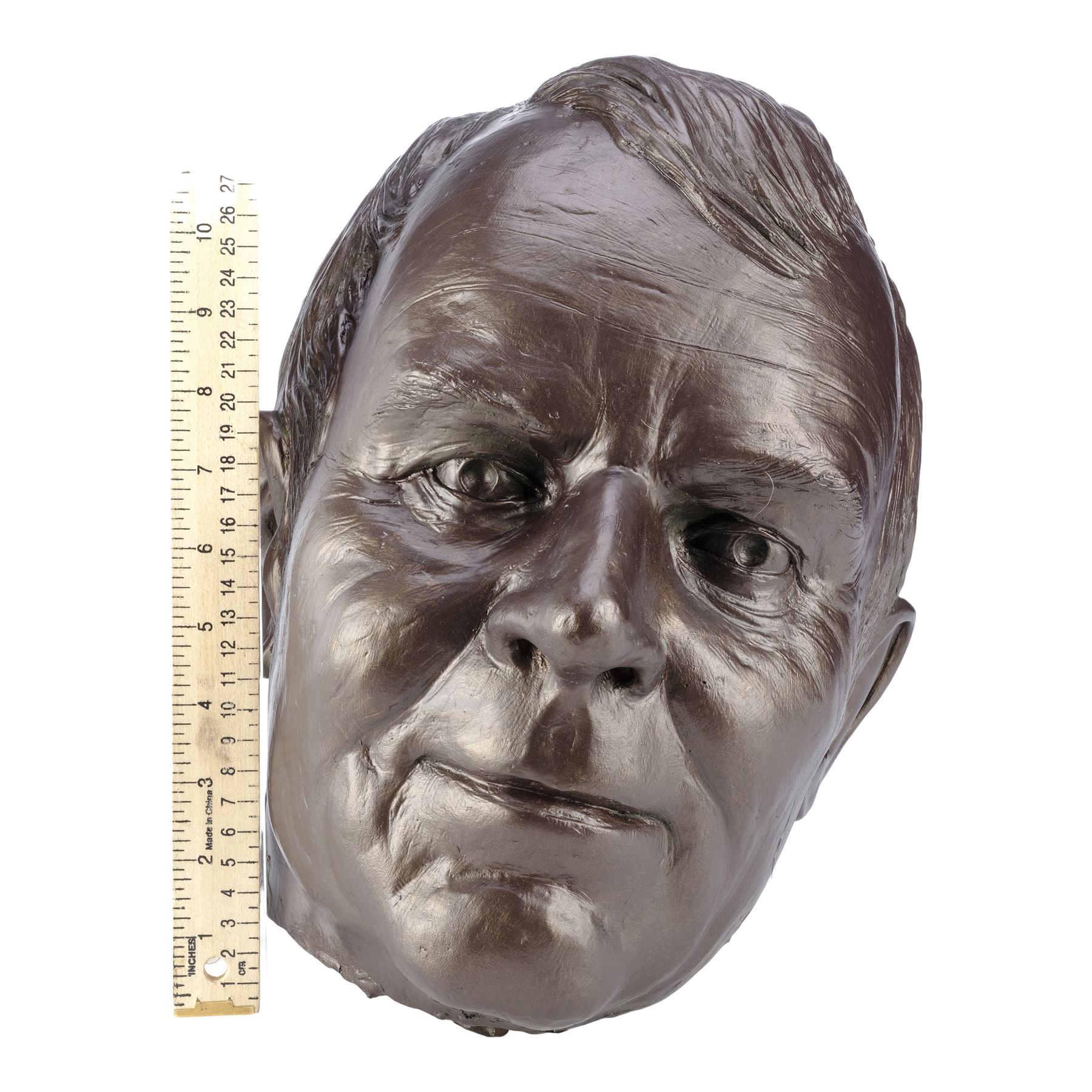 This fiberglass statue head is painted to resemble bronze with metal brackets along the base and a dark bronze-color painted fiberglass neck piece. It exhibits minor glue residue and tarnishing along the brackets. Dimensions: (head) 9" x 12.5" x 12.5" (23 cm x 31.75 cm x 31.75 cm)