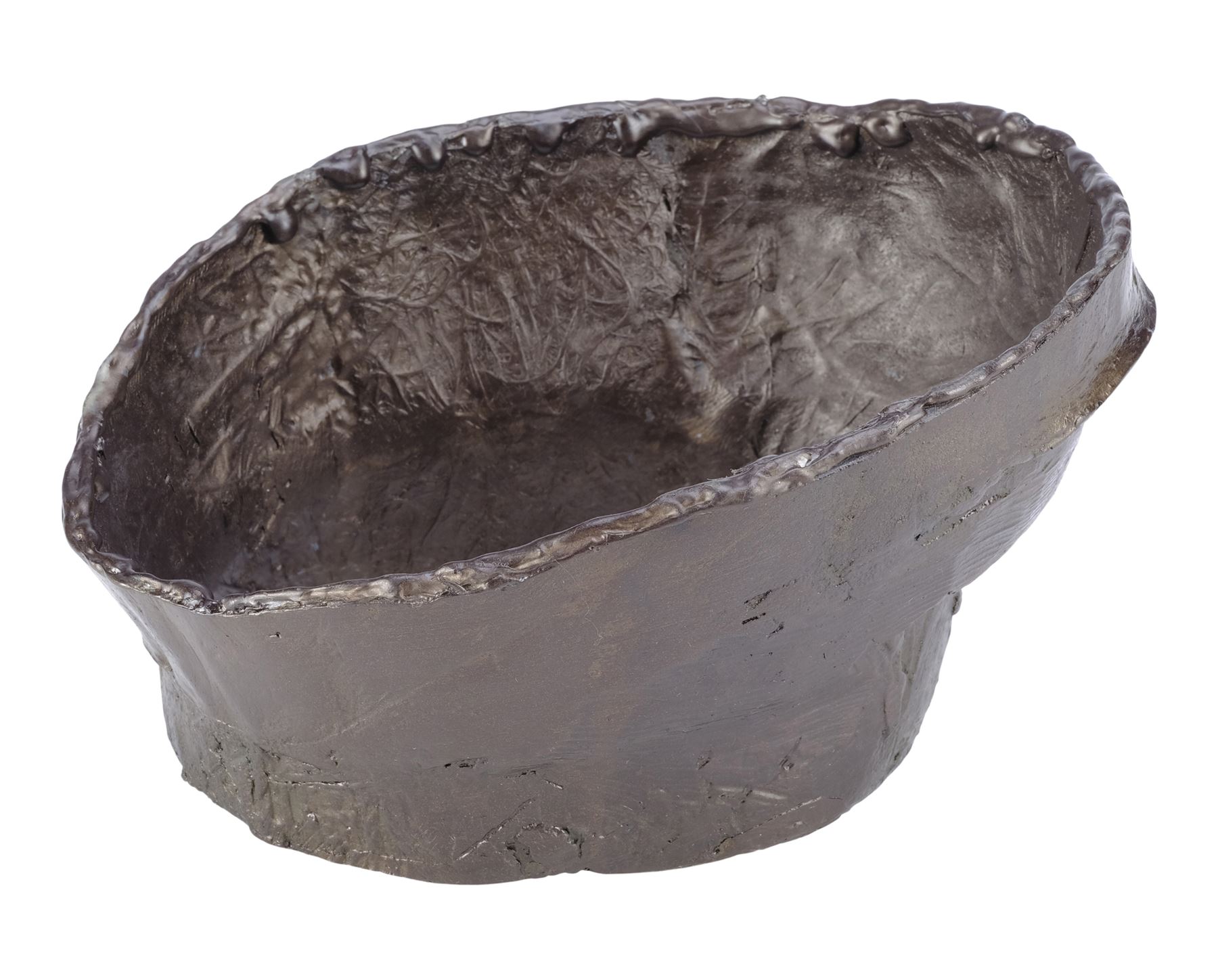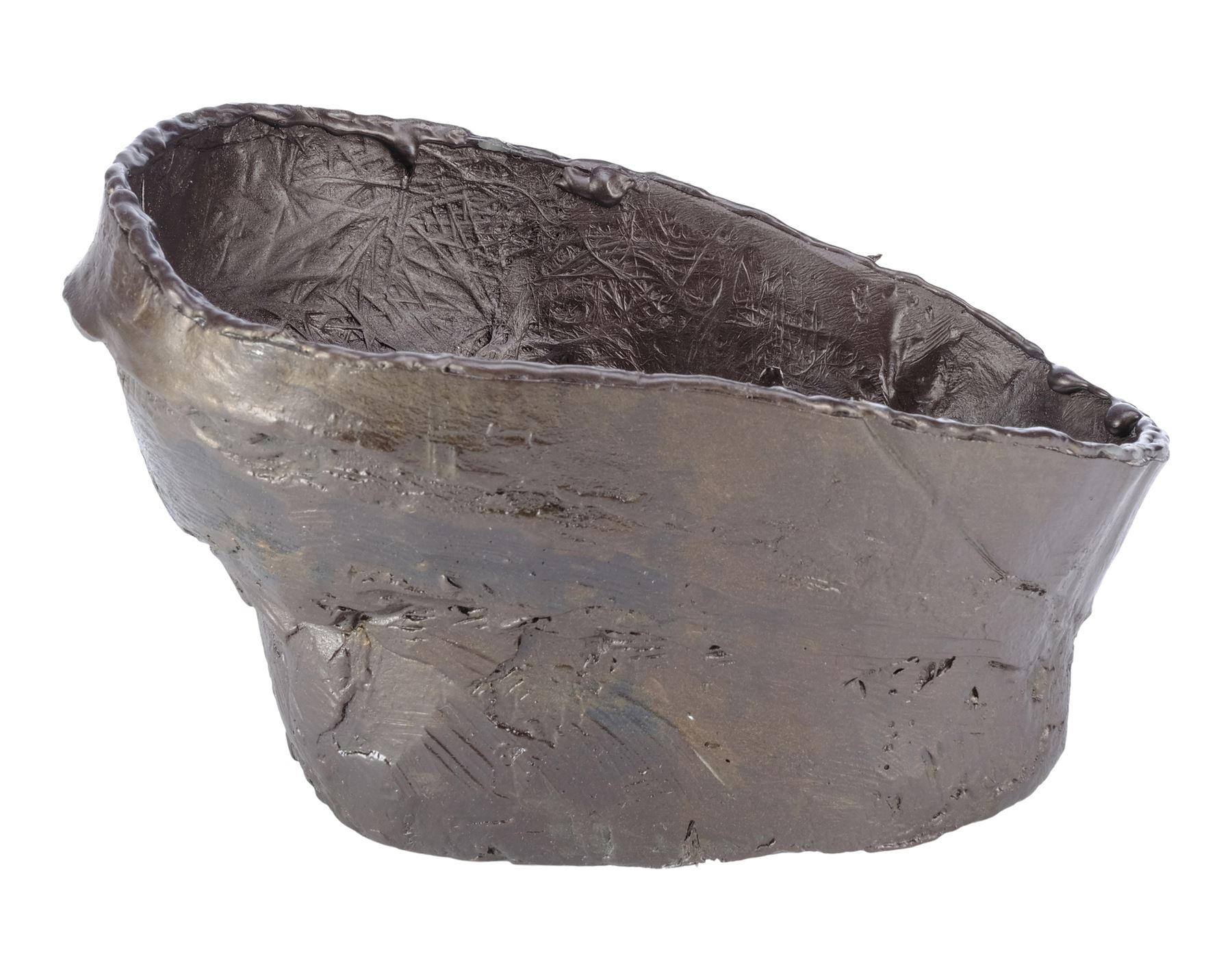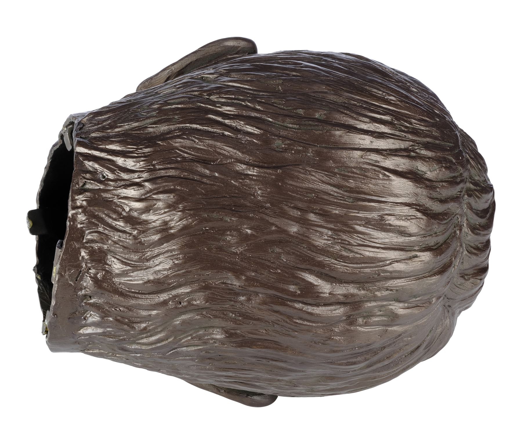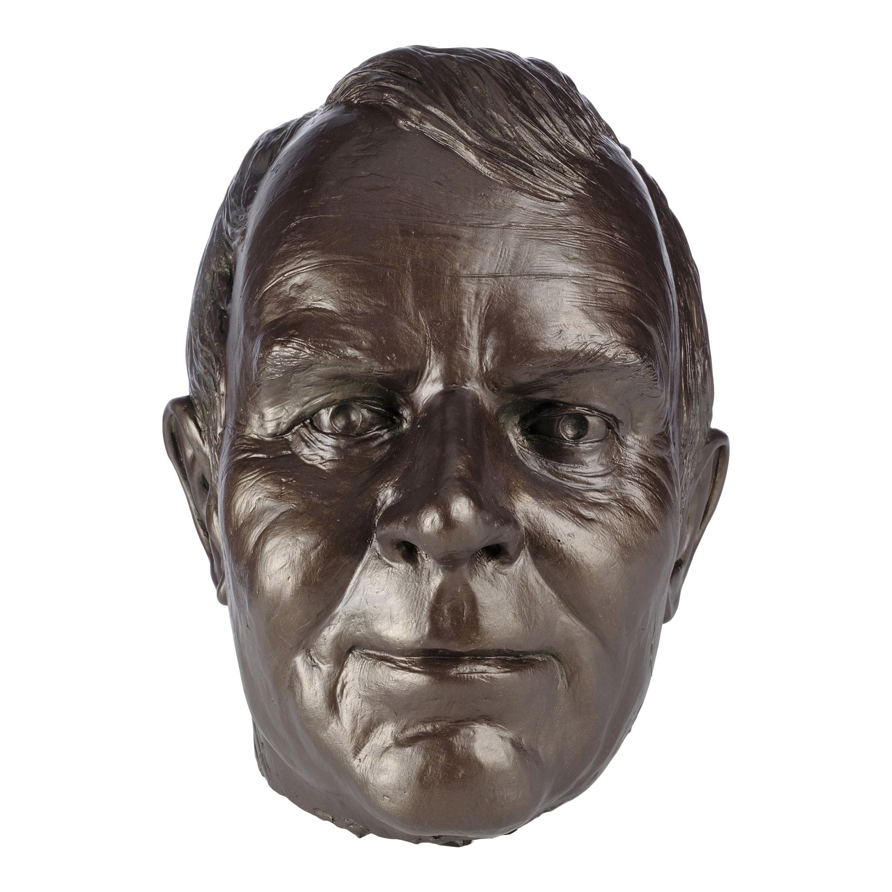 This fiberglass statue head is painted to resemble bronze with metal brackets along the base and a dark bronze-color painted fiberglass neck piece. It exhibits minor glue residue and tarnishing along the brackets. Dimensions: (head) 9" x 12.5" x 12.5" (23 cm x 31.75 cm x 31.75 cm)