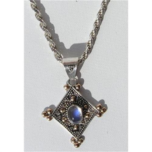 This is a wonderful vintage sterling silver Italian pendant on a heavy woven chain. Weighs in at 20gr and is in perfect mint condition. The chain is 12" closed loop and drops to a Victorian looking pendant that holds a pale blue stone. I don't know what type the stone is but it is beautiful. Fully marked in two places on the chain and again on the back of the pendant.