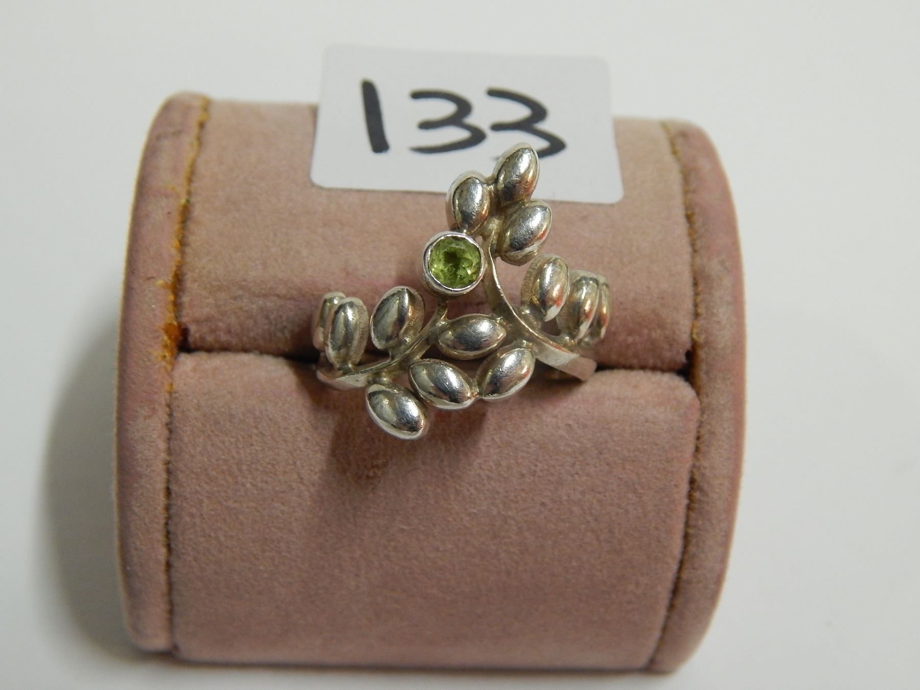 925 STERLING SILVER RAP AROUND GRAPE LEAFS AND GREEN CRYSTAL STONE / RING SIZE 8 1/2 - 5.1 gr.