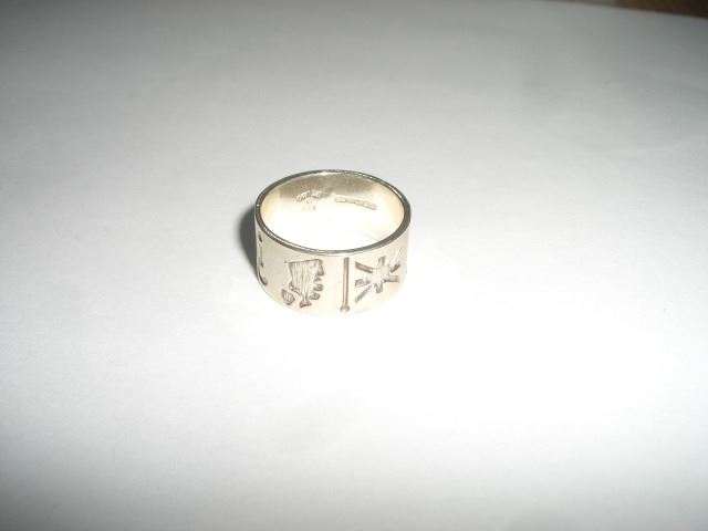 .925 STERLING SILVER RING WITH BEUATIFUL WITH BEAUTIFUL DESIGN & INSCRIPTION TOTAL WEIGHT IS 6.2g STAMPED *MADE IN LRELAND .925*! RING CAME OUT OF SAFE BOX!! ***Coin, Currency & All Items Listed in this auction - Grades, Conditions and Values are not Safe Deposit Coins LLC Responsibilty. Grades, Condition and Values are determined by Consigner(s) & Buyers