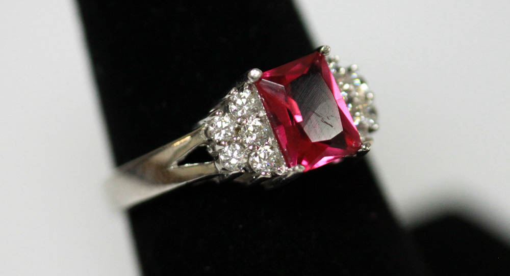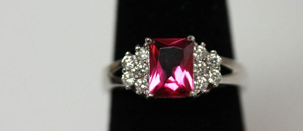 .925 STERLING SLIVER MODERN RING W/PINK AND WHITE CZ **|**|** .925 STERLING LIVER MODERN RING W/RED AND WHITE CZ SIZE:7