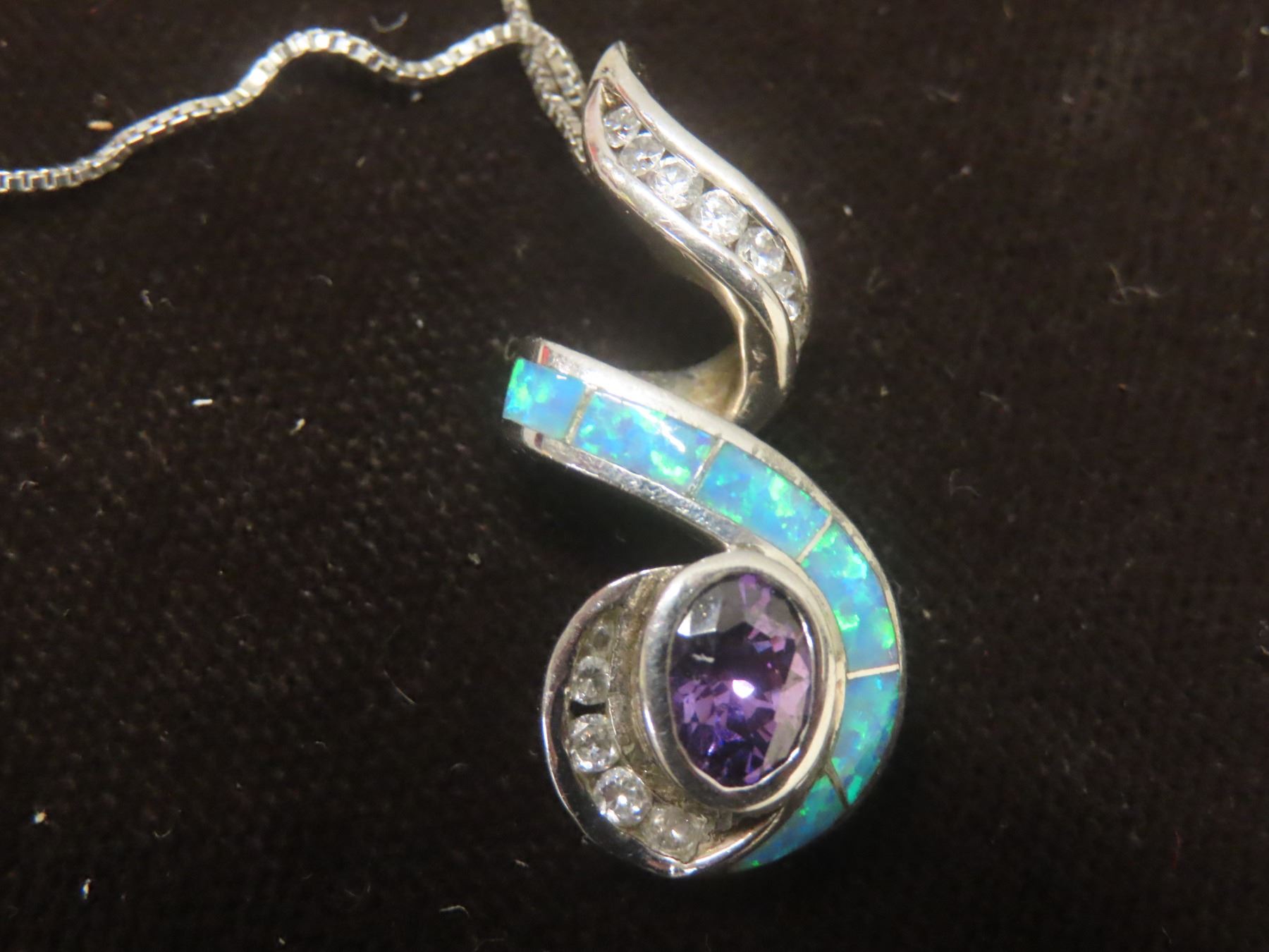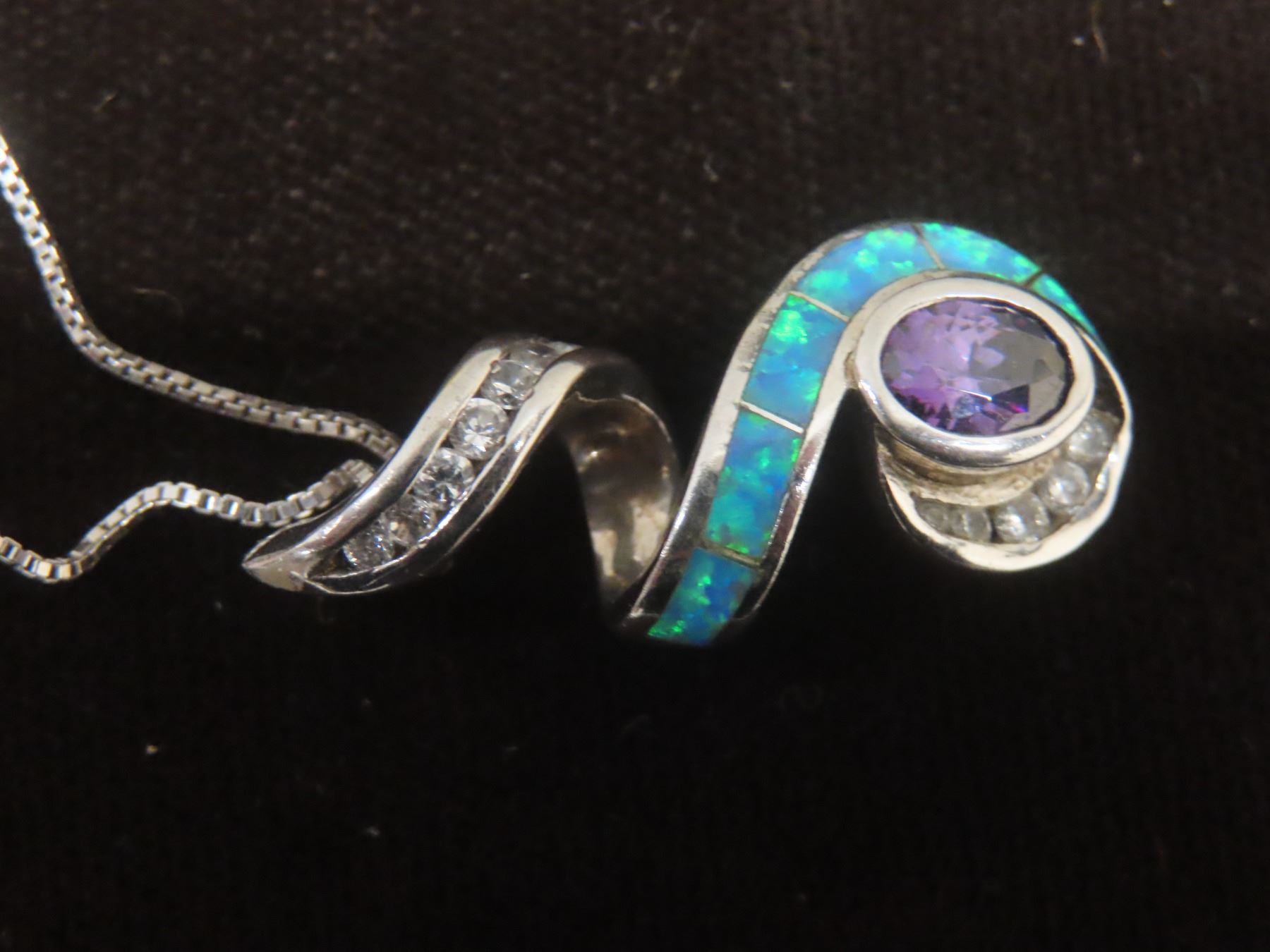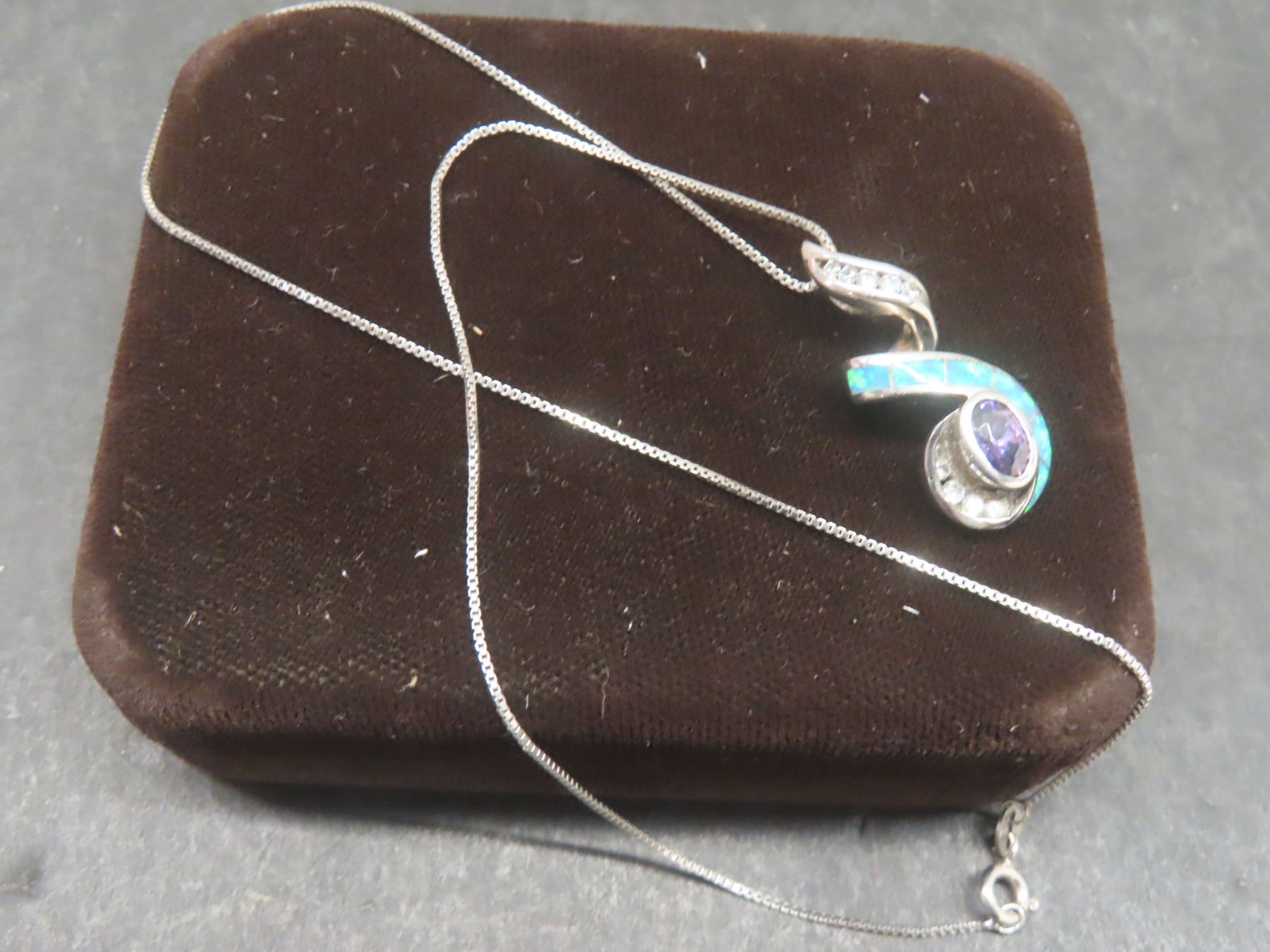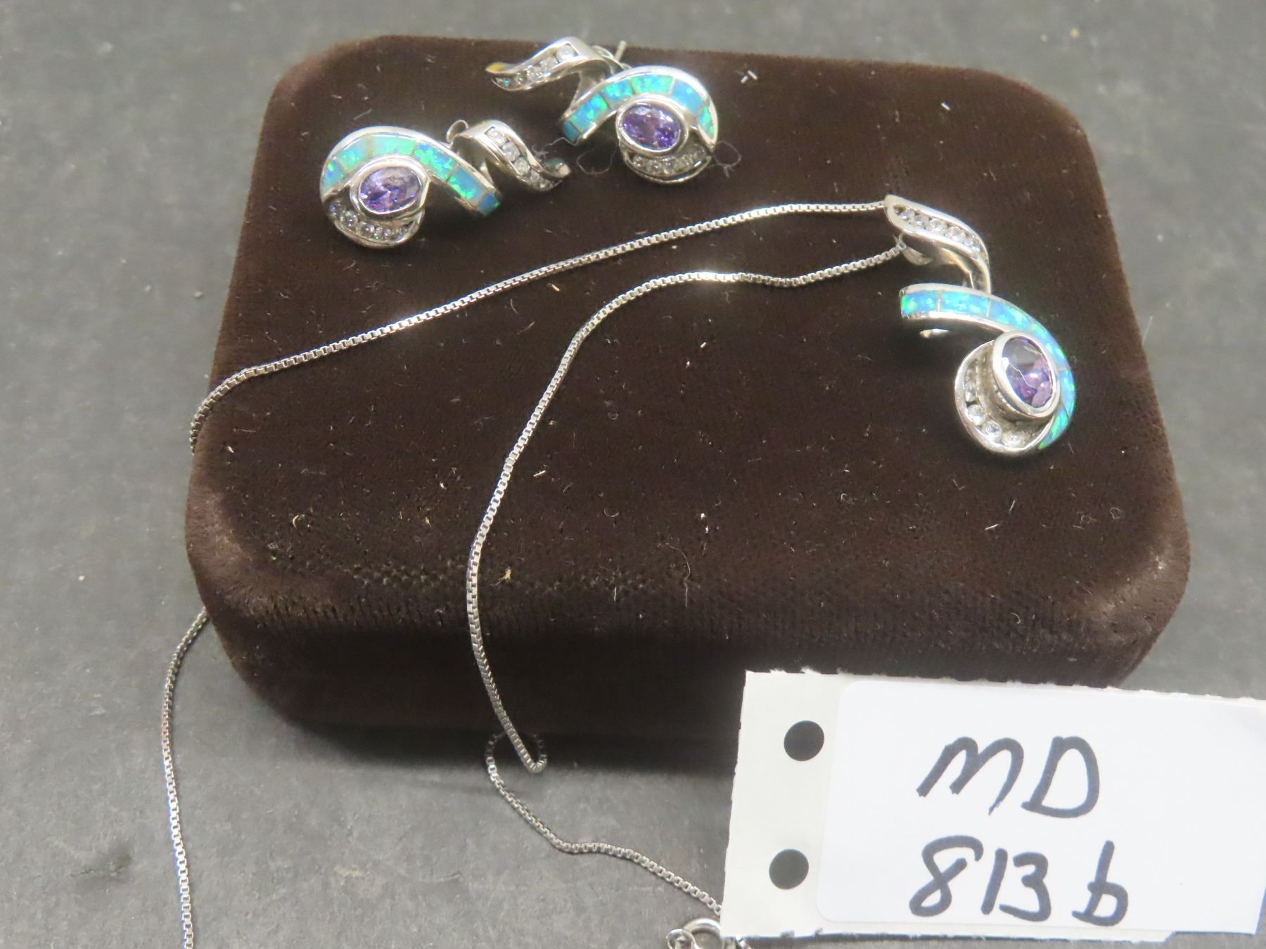 925 Silver And Blue Opal Necklace With Matching Stud Earrings