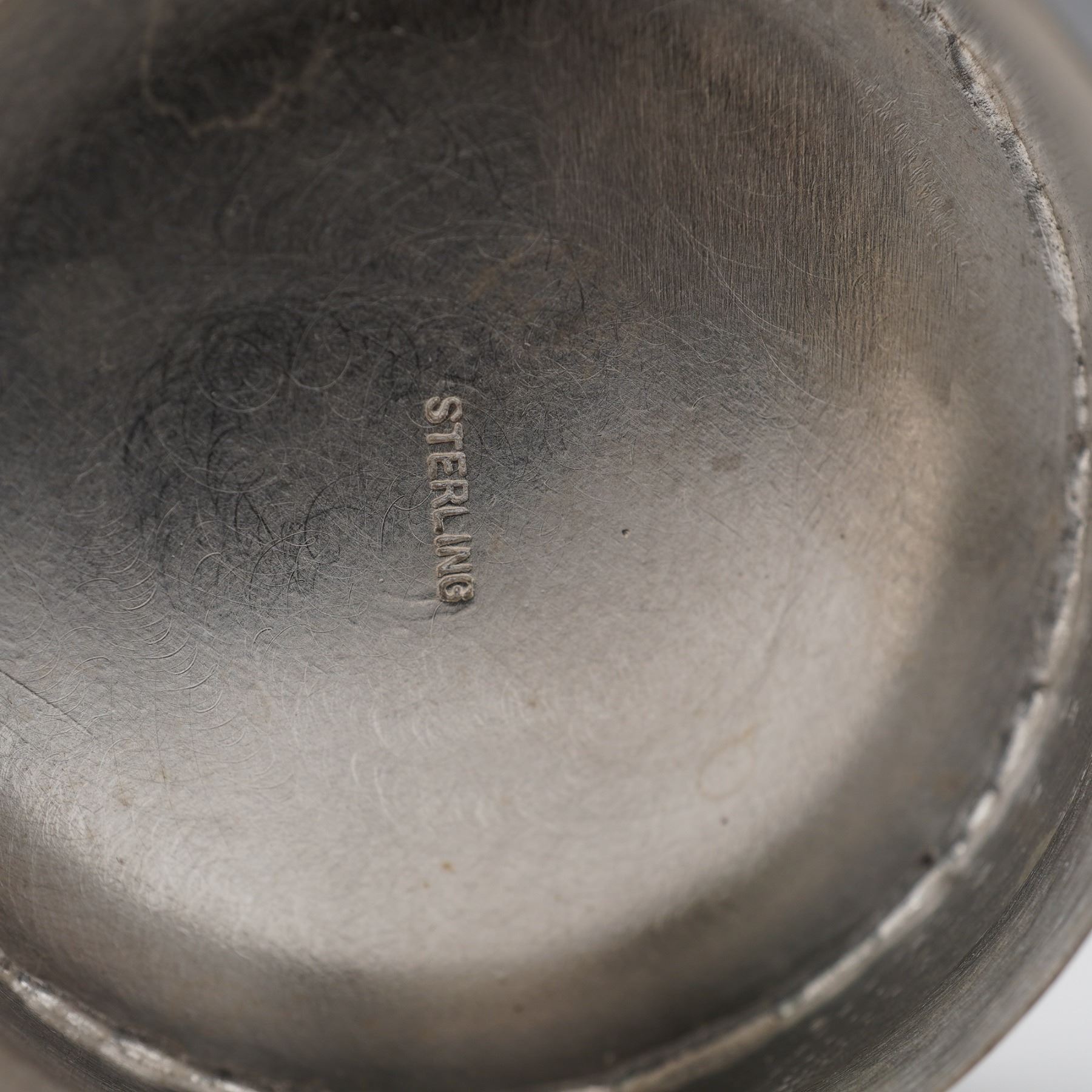 This sterling silver pill box features a hand-chased golf scene on the cover, capturing a golfer in mid-swing with intricate detail. The box has a smooth, polished finish and is marked "Sterling" on the inside. Its compact design makes it both a functional and decorative accessory. Net Silver weight 0.52 troy oz.