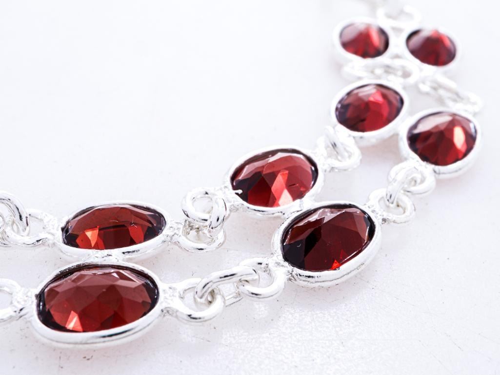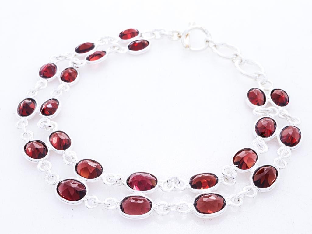 925 Sterling Silver Bracelet, Double Row Bezel Set Genuine Oval Cut Garnets