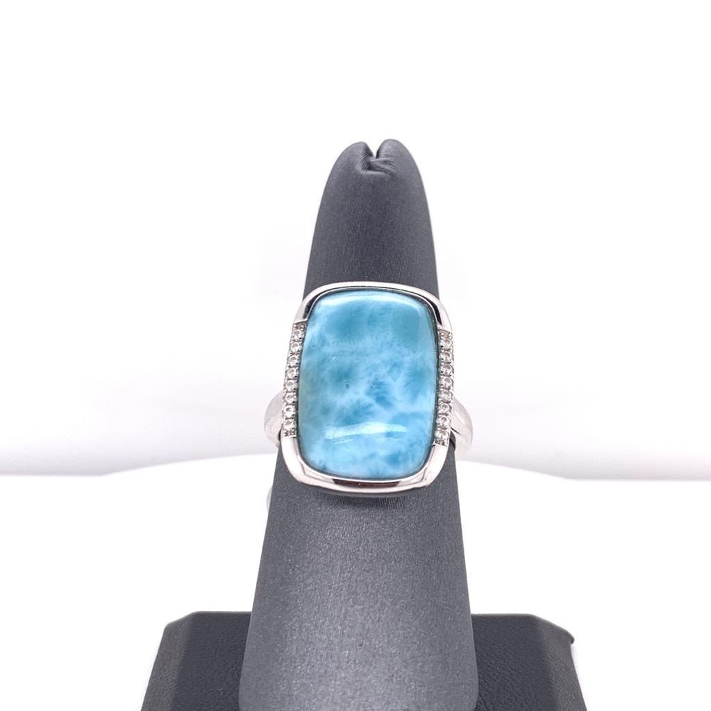 925 Sterling Silver Ring With "Larimar" The Gem Stone Found In The Caribbean In The Dominican Republic Set In The Center With Cubic Zirconia Set On Either Side With A Filigree Design Under The Basket All Around. Set In Silver With Rhodium Coating.