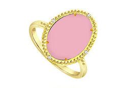 This beautiful ring is made in 18K yellow gold overlay Vermeil with center in large prong set oval shape cabochon pink chalcedony surrounded by silver dots and four small round white CZs sparkling in between silver dots. It has a total gem weight TGW of 15.08 carats.