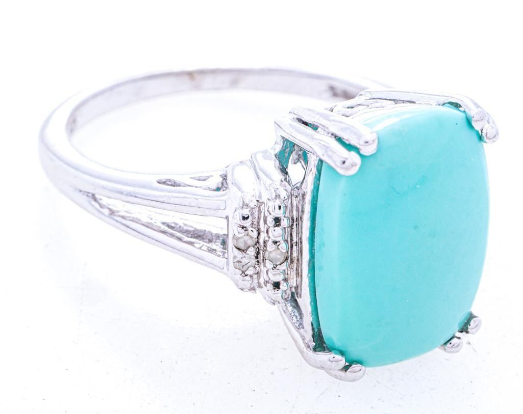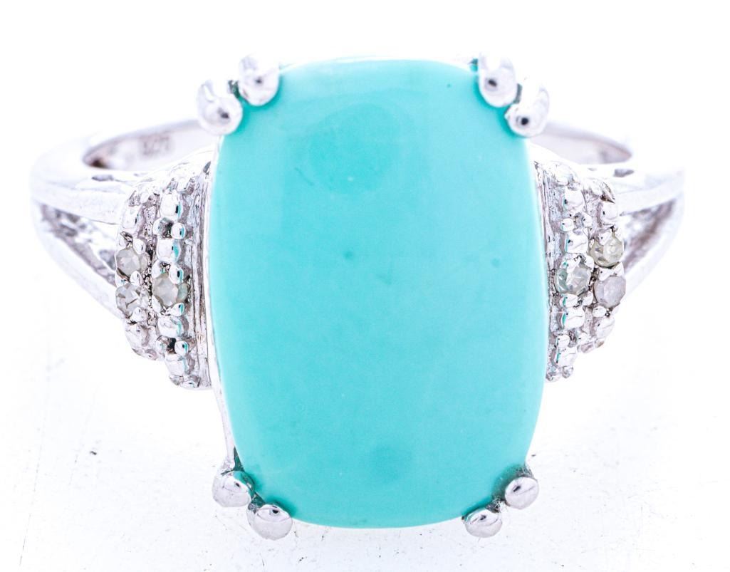 925 Sterling Silver Ring, 6 Diamonds & Rectangular Turquoise