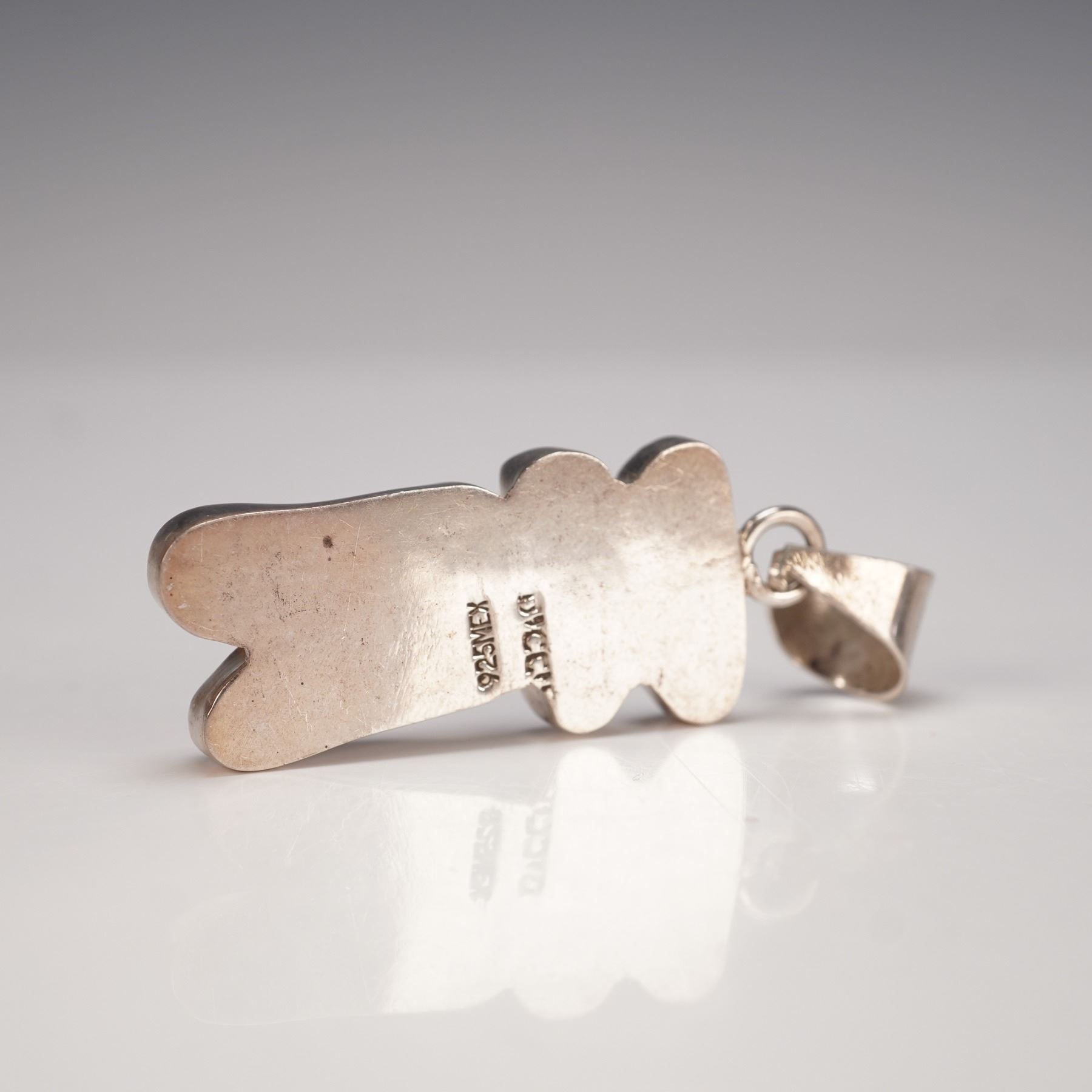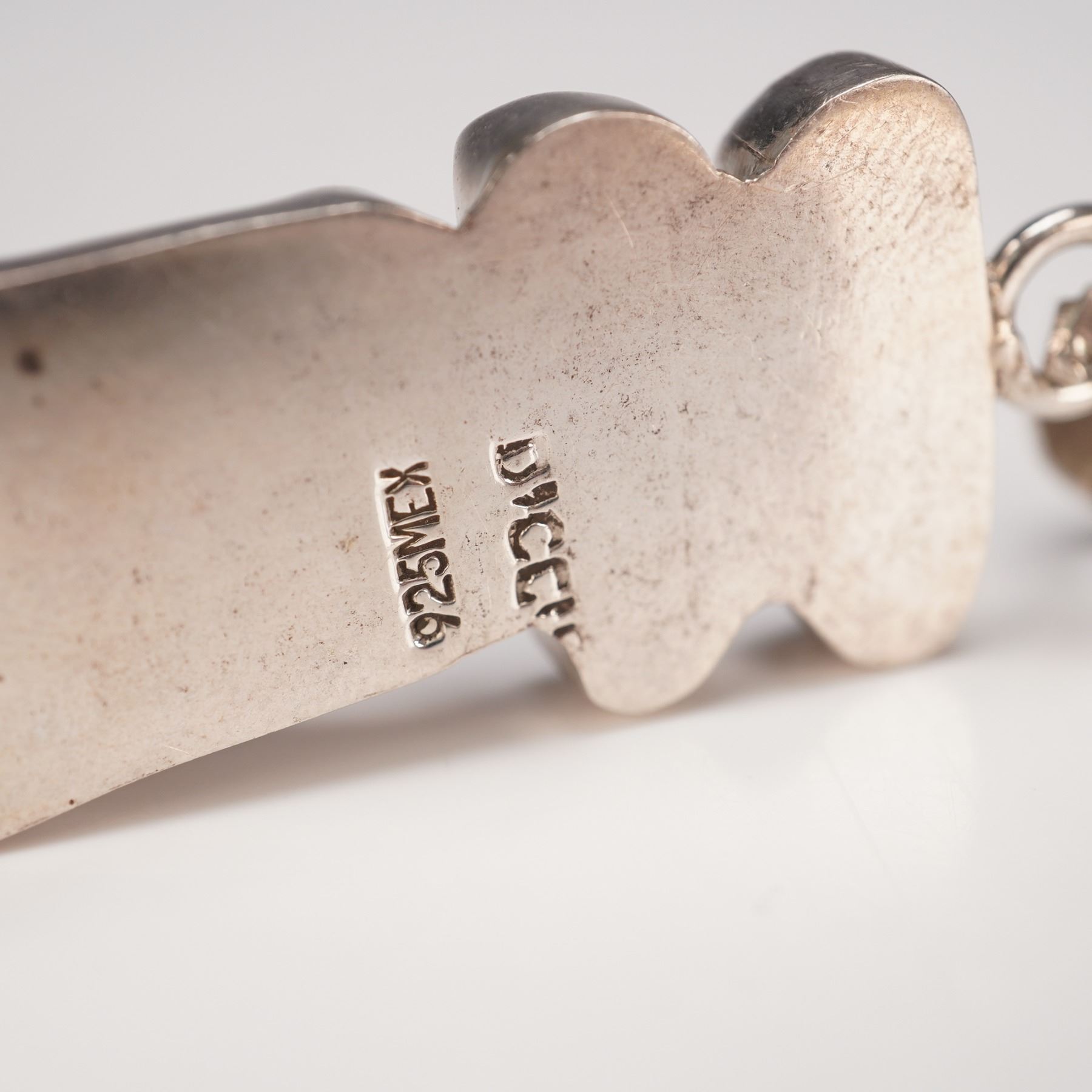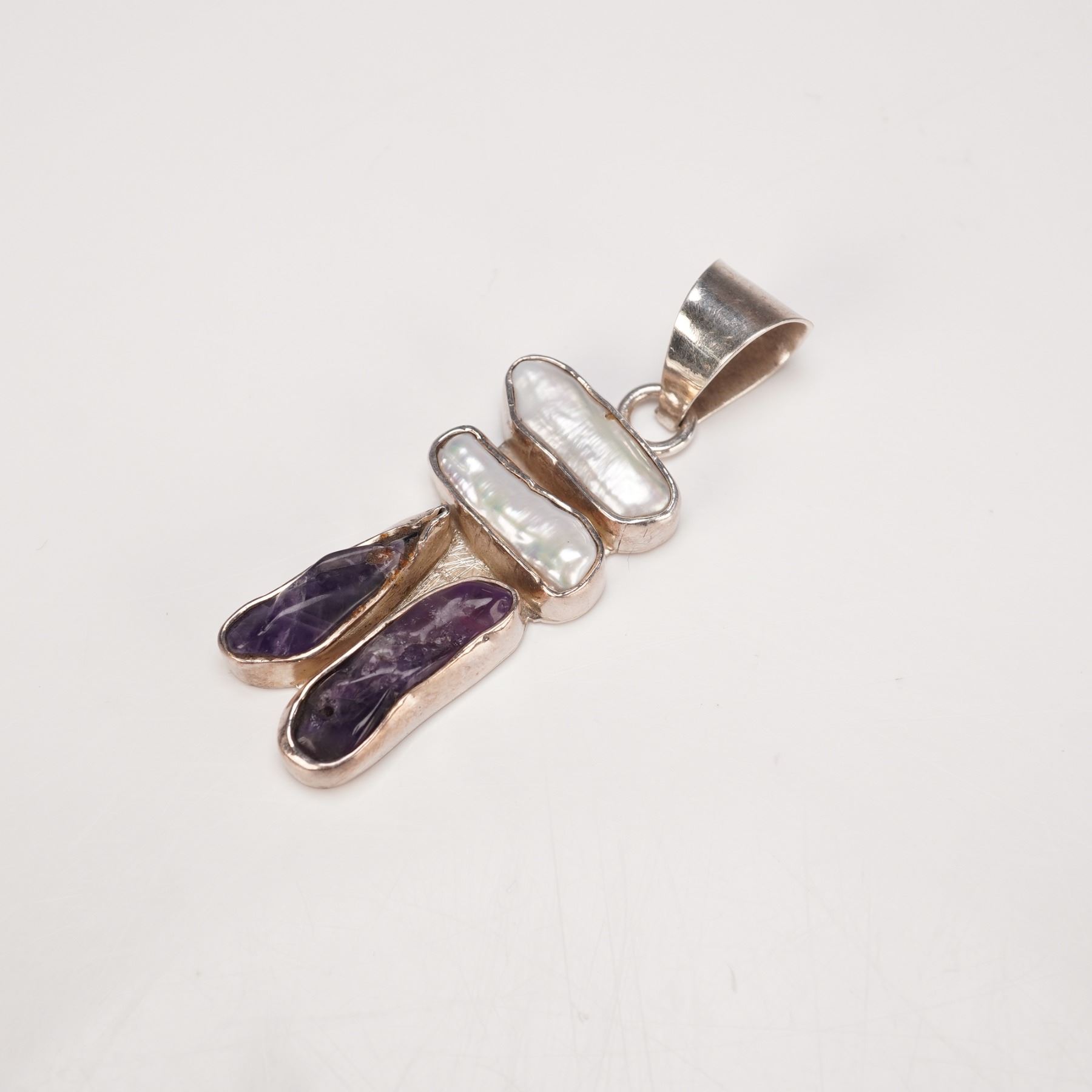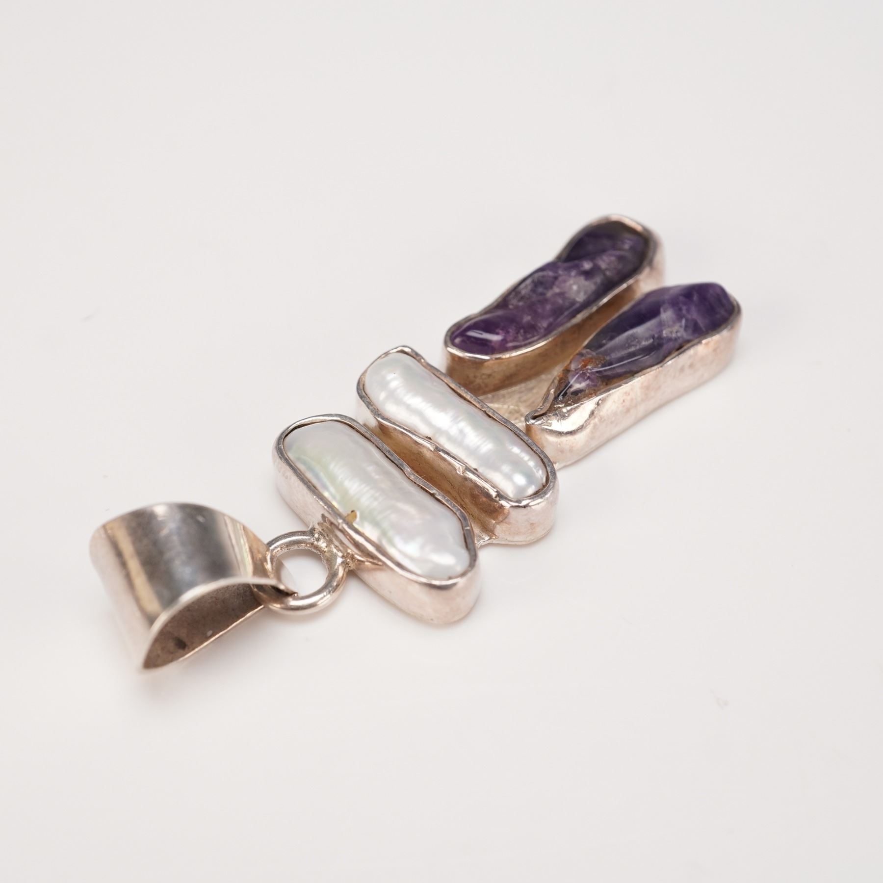 This striking pendant features a creative and artistic design, combining squiggly-shaped faux pearls with vibrant purple stones, set in sterling silver. The unique shape and playful arrangement of the pearls and stones create a bold, contemporary style that blends elegance with an abstract feel. Marked 925MEX, the piece is crafted with quality materials and showcases a modern, sculptural aesthetic. The overall weight is 0.4 oz, and it measures approximately 2.25"H. This pendant is an eye-catching statement piece, perfect for those who appreciate distinctive and artistic jewelry design.