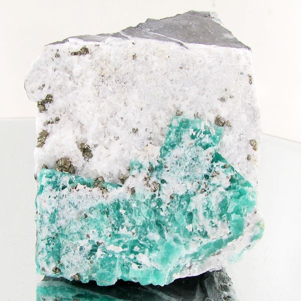 Excellent specimen with pyrite crystals and small emerald crystal vein on base material