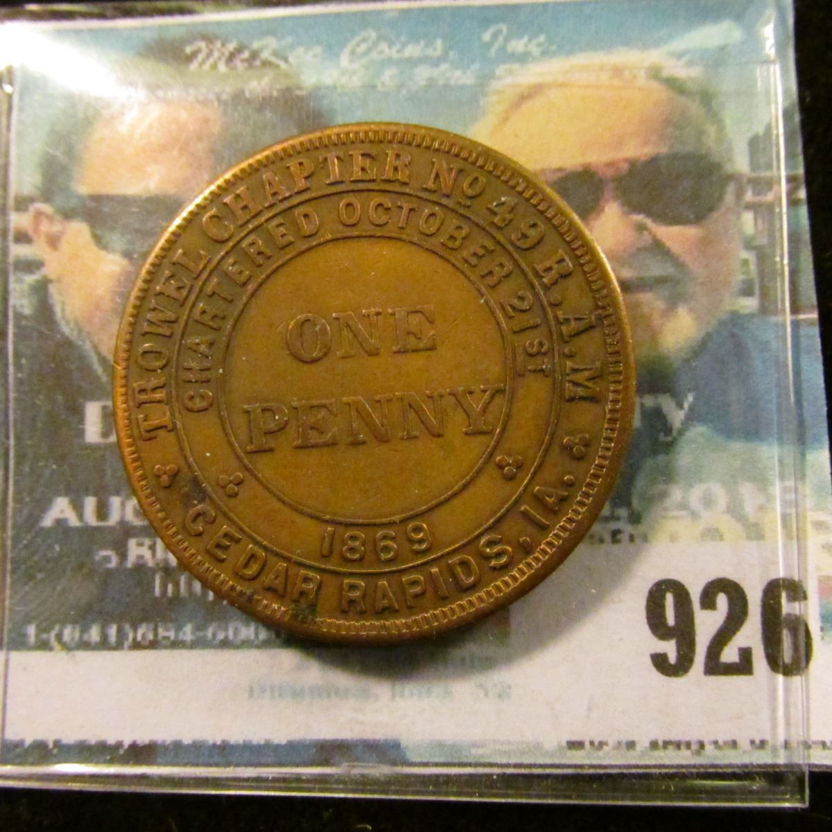 926 _ "Trowel Chapter No.49 R.A.M./Chartered October 21st/1869/One/Penny/Cedar Rapids, Ia." Masonic