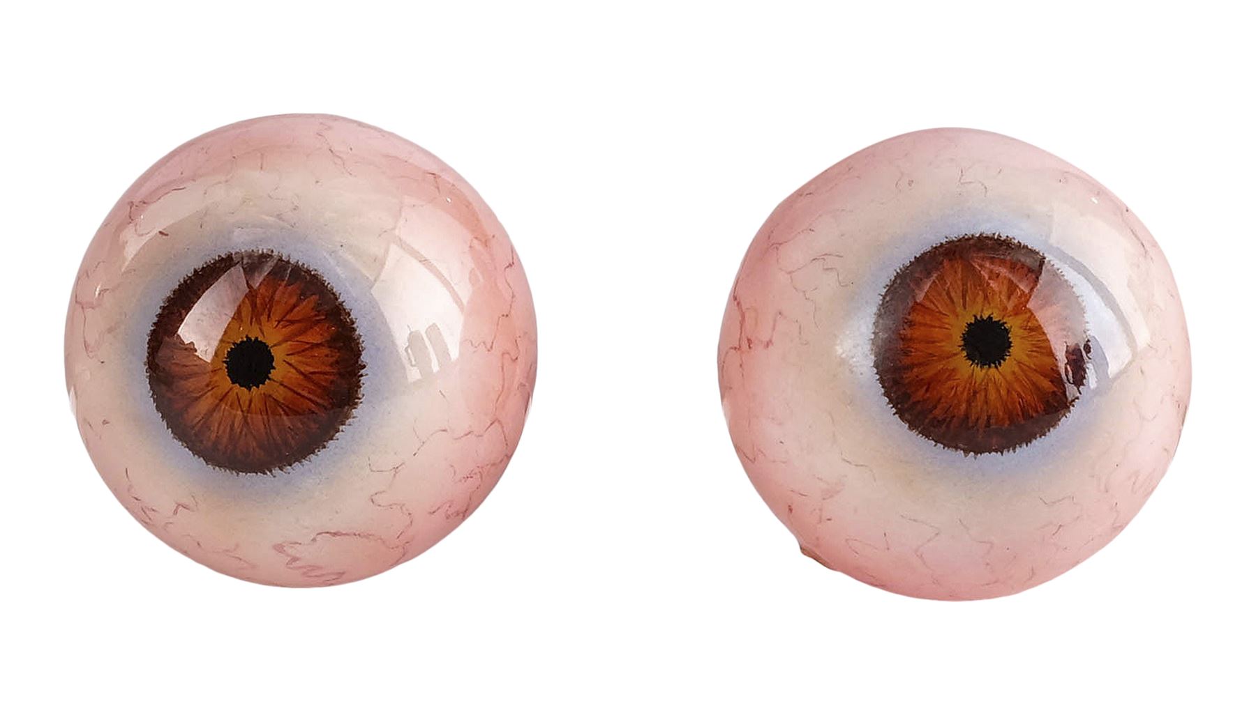 This lot consists of two handpainted test eyes made of acrylic. Each eye features a brown iris with yellow and black accents as well as a small black pupil. These hollow eyes have small parallel production-made holes at the back, and have been filled with blue putty for stability. This lot exhibits some discoloration around the holes. Dimensions: (each) 1" x 1" x 1" (2.5 cm x 2.5 cm x 2.5 cm)