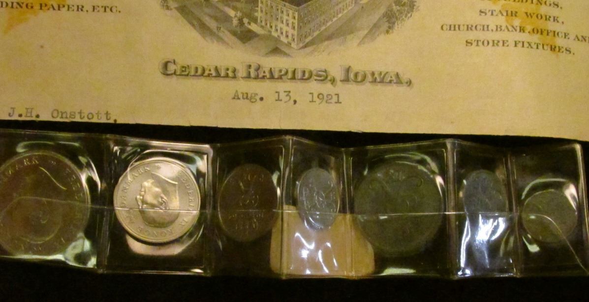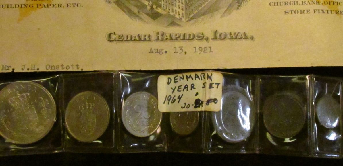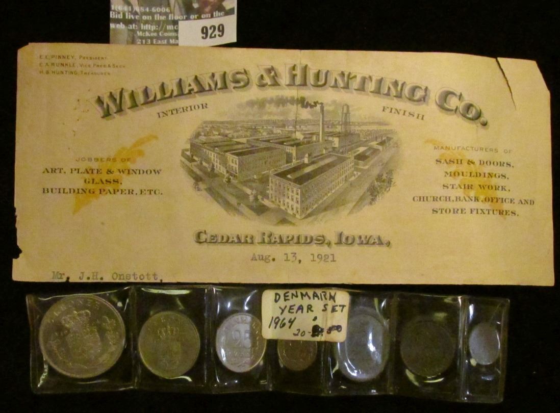 Letter Head "Williams & Hunting Co. Interior Finish…Cedar Rapids, Iowa, Aug. 13, 1921"; & a Uncirculated 1964 Denmark Mint Set in vinyl holder, Five Kroner to One Ore. (7 pcs.)