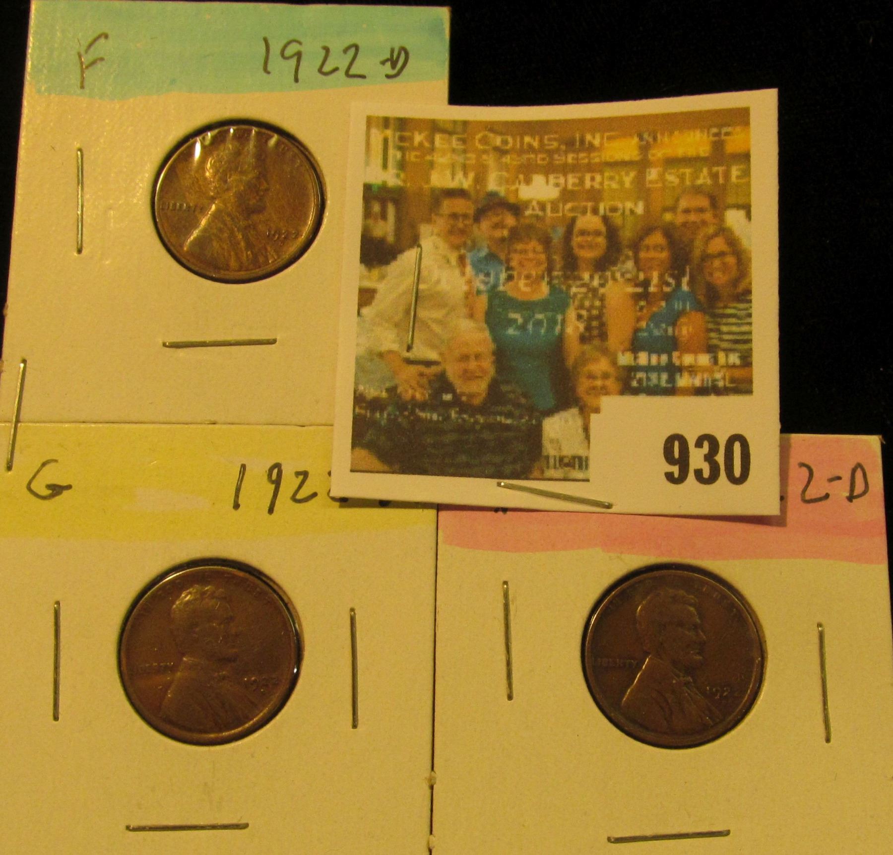 930 _ (3) 1922 D Lincoln Cents, all Semi-key Date and grading Good to Fine.