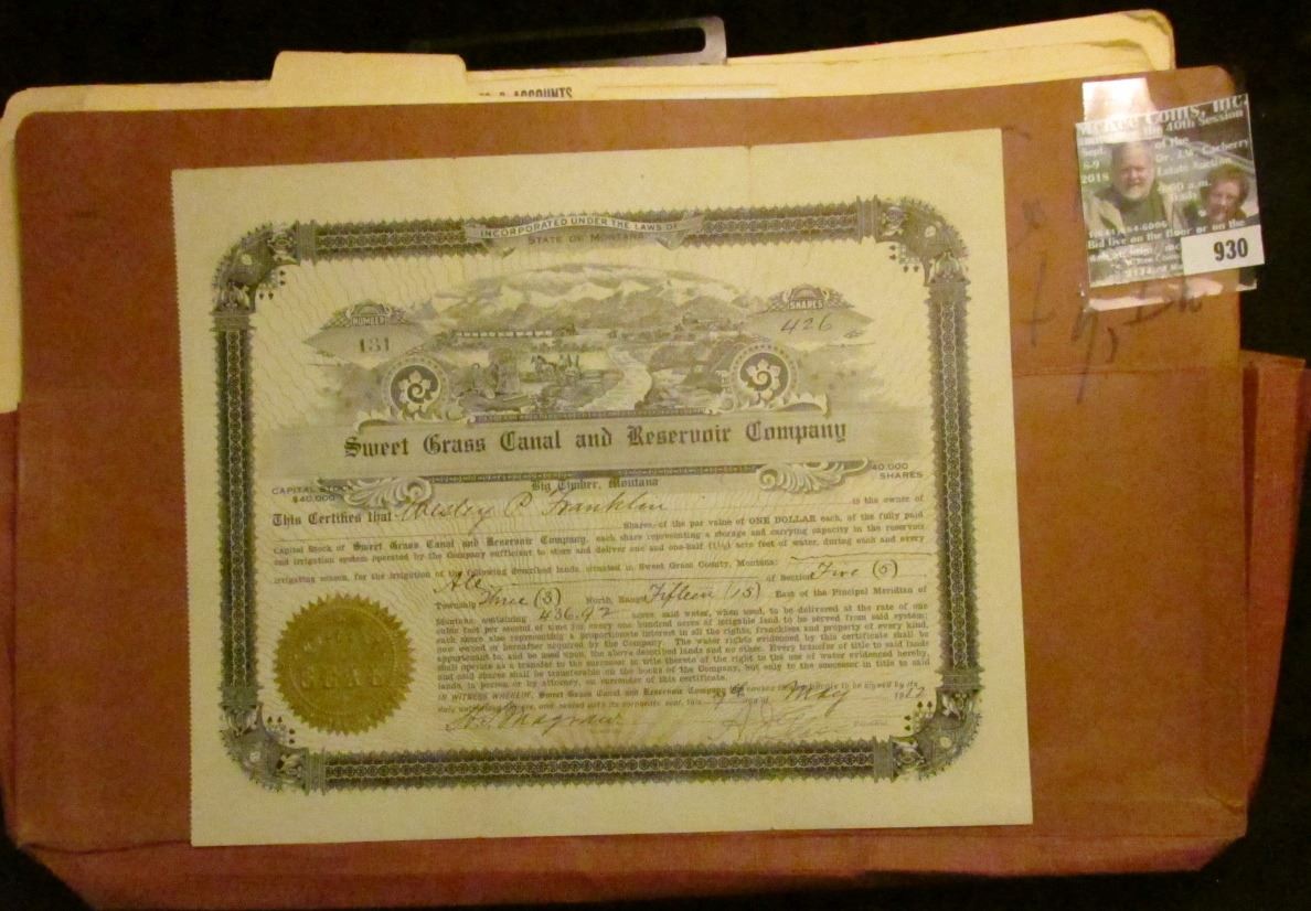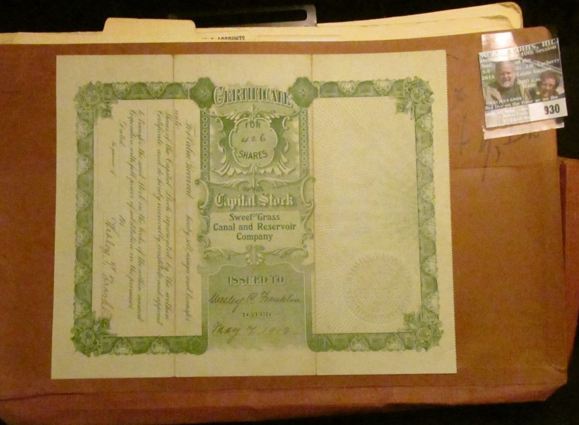 File Folder; Number 131 Stock Certificate for 426 Shares "Sweet Grass Canal and Reservoir Company Big Timber, Montana" dated May 7th, 1912; 1959 Denmark 25 Ore, Y60, BU; & April 1992 "Knights of Columbus Magazine Columbia".