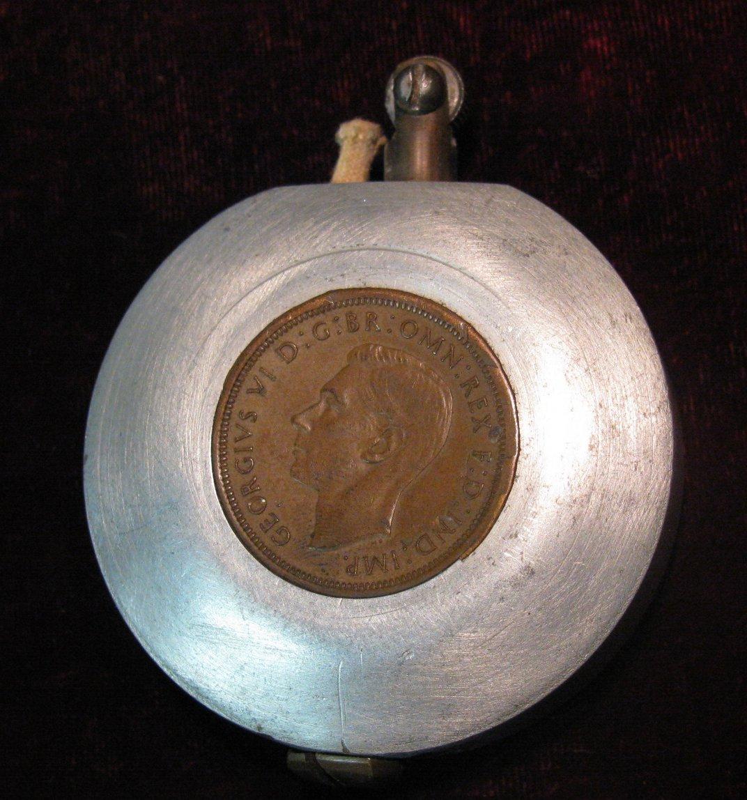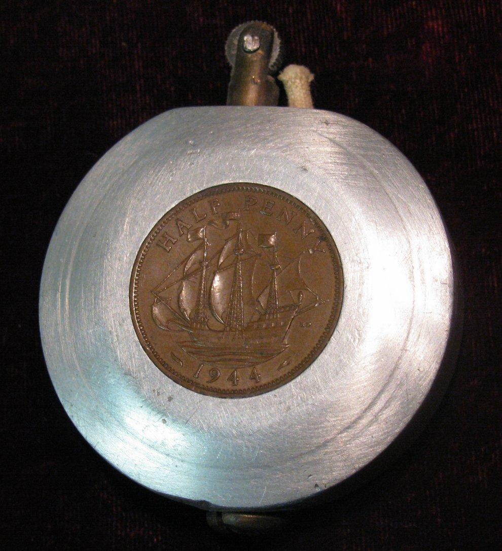 930. WWII Lighter Imbedded with 1944 British Half-Penny.