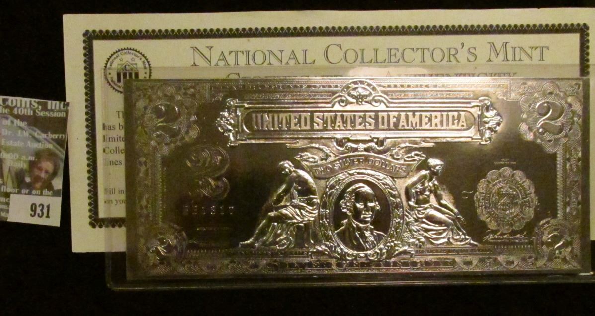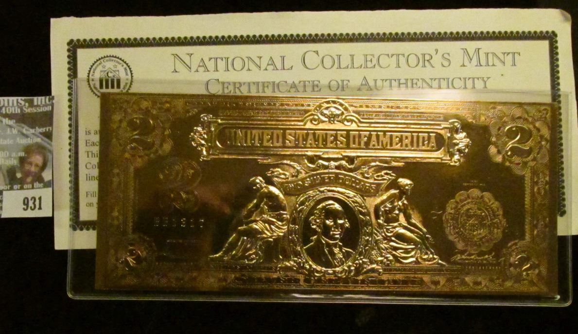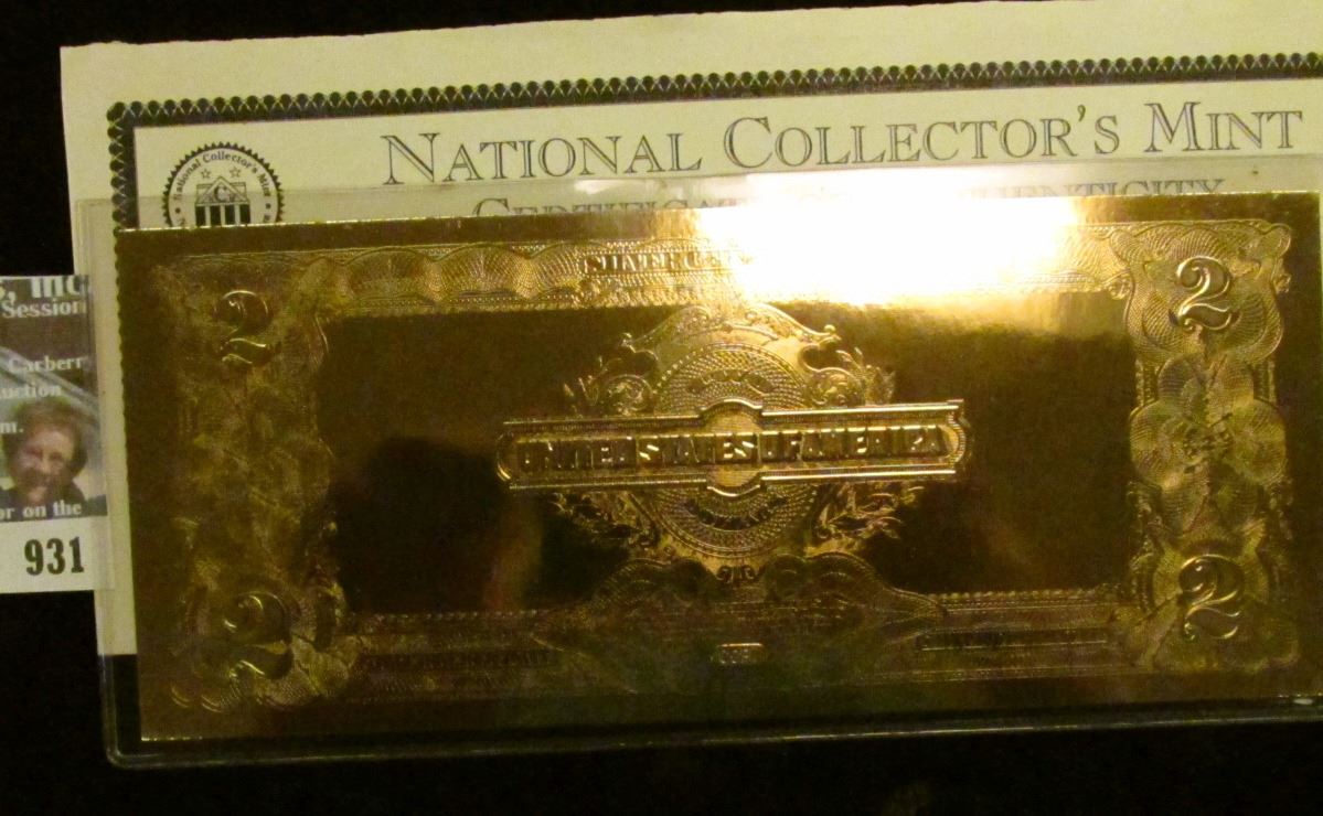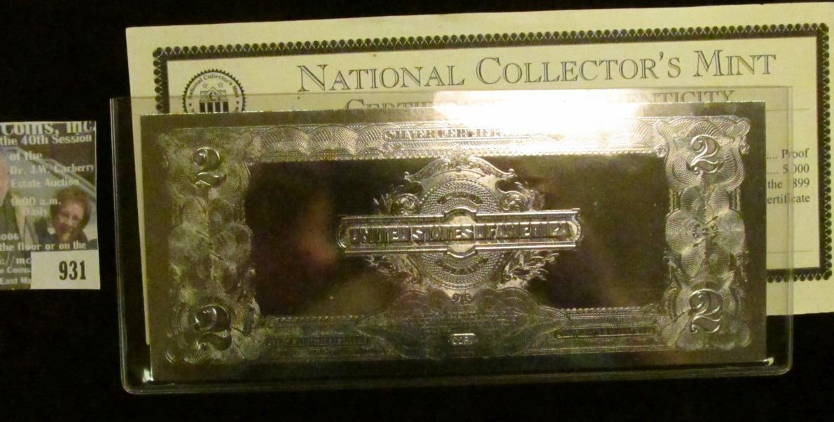 Copies of Series 1899 $2 large size Silver Certificates individually die-struck in .999 Pure Silver & 22 Kt. Gold by the National Collector's Mint.