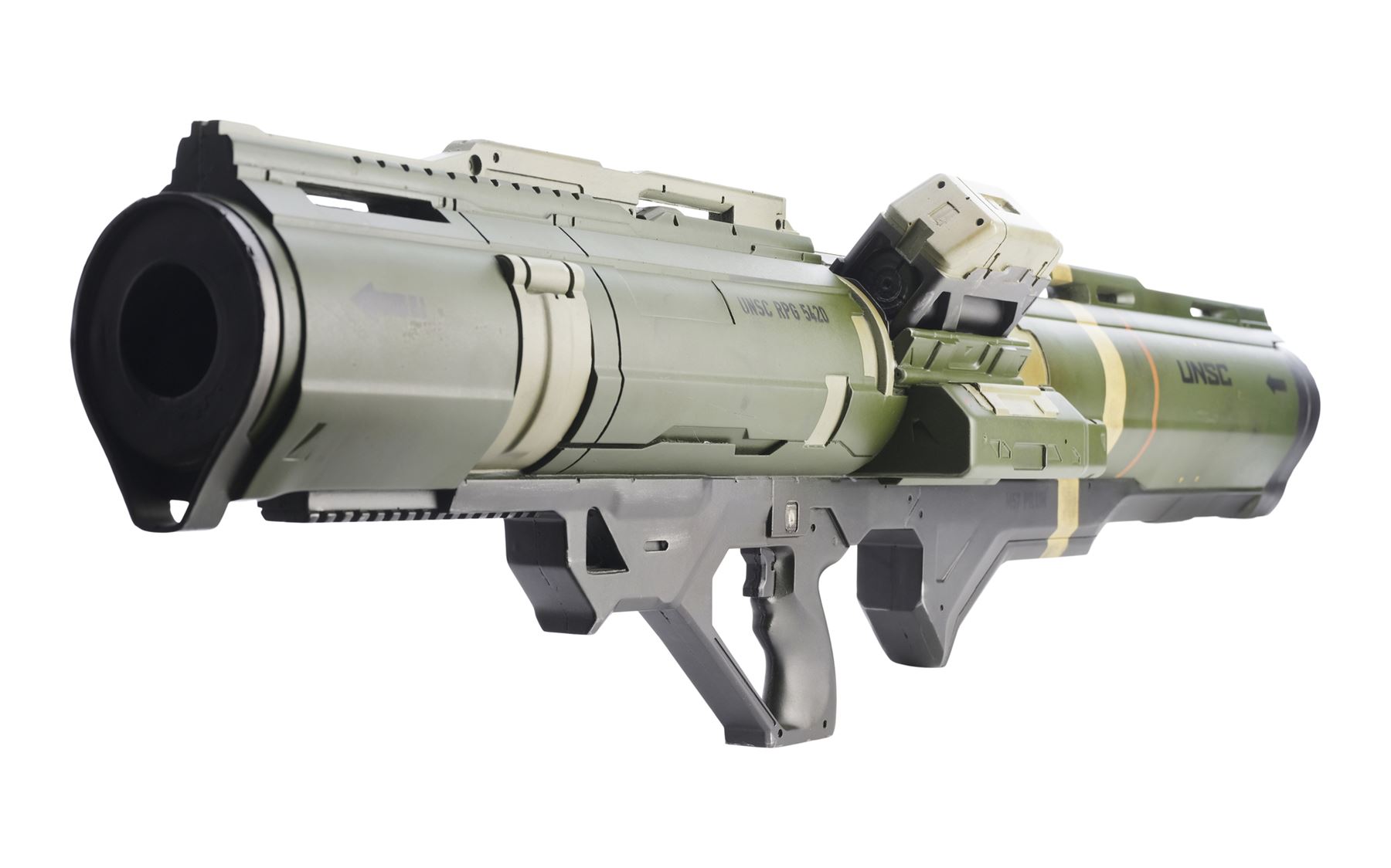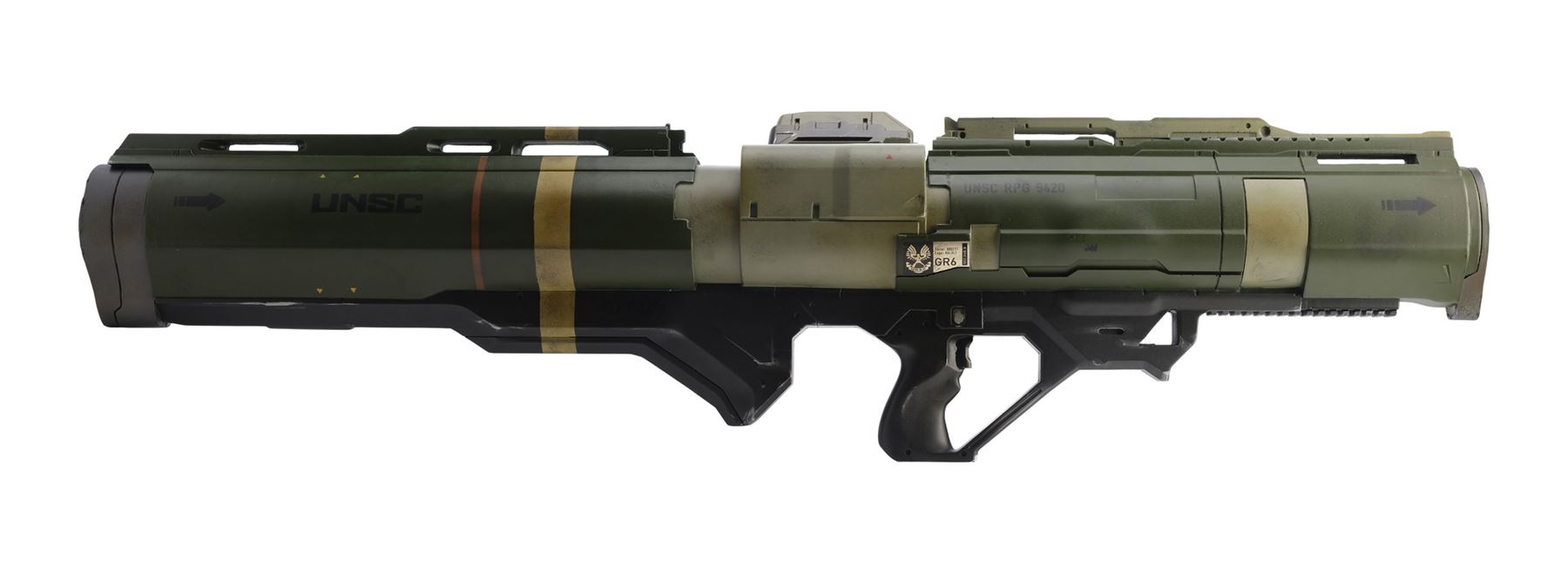 Originally introduced in the game Halo 5: Guardians, this lot consists of one rocket-propelled grenade launcher made of rigid foam and resin painted in shades of black and olive green. It features a "UNSC RPG 5420" stamp on the sides in black, as well as "UNSC" toward the back, and "M57 PILUM." This lot exhibits scuffs, worn off print, discoloration, and a buildup of grime. Dimensions: 48" x 10" x 12" (122 cm x 25.5 cm x 30.5 cm)
