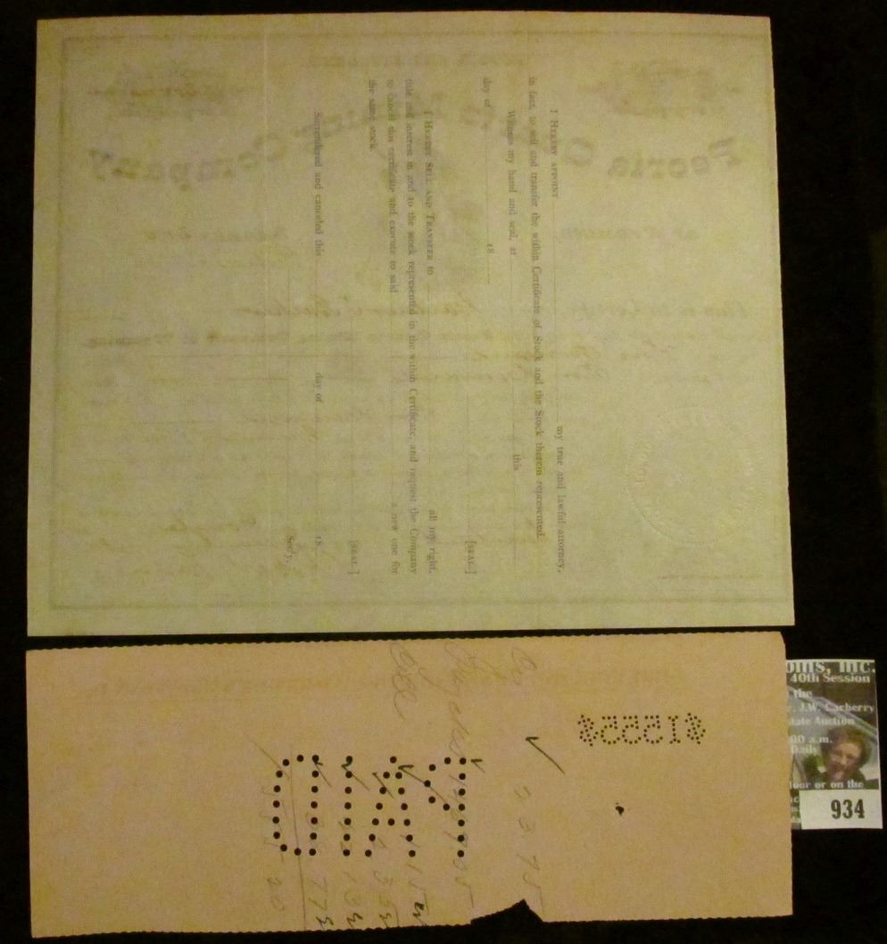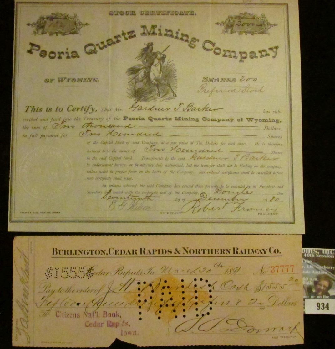 Number 182 Stock Certificate for $2000 "Peoria Quartz Mining Company of Wyoming Shares 200", embossed Notary seal, central vignette Indian with spear on horseback; & 1899 Check with Gold Revenue Stamp from "Burlington, Cedar Rapids & Northern Railway Co."