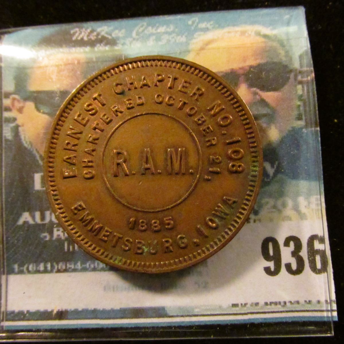 936 _ "Ernest Chapter No.108/Chartered October 21st/1885/ R.A.M./Emmetsburg, Iowa", reverse "One/Pen