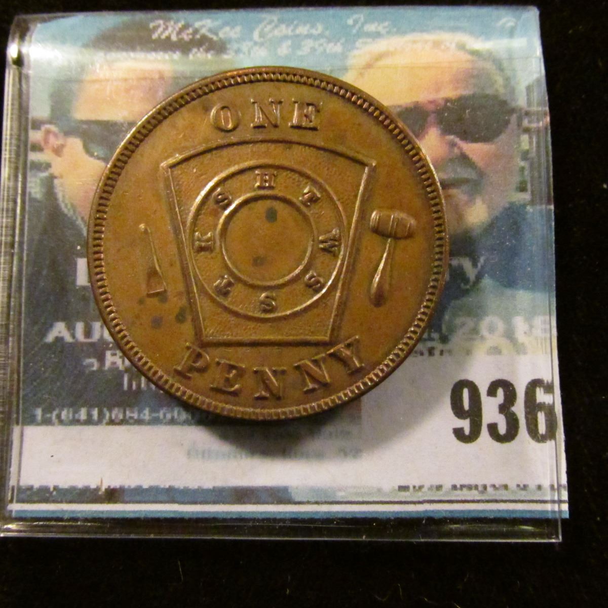 "Ernest Chapter No.108/Chartered October 21st/1885/ R.A.M./Emmetsburg, Iowa", reverse "One/Penny" Masonic Penny. Brown Choice EF.