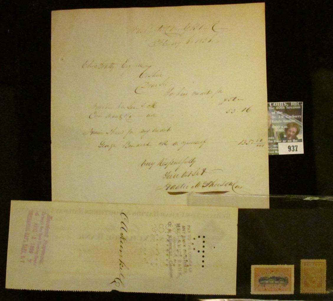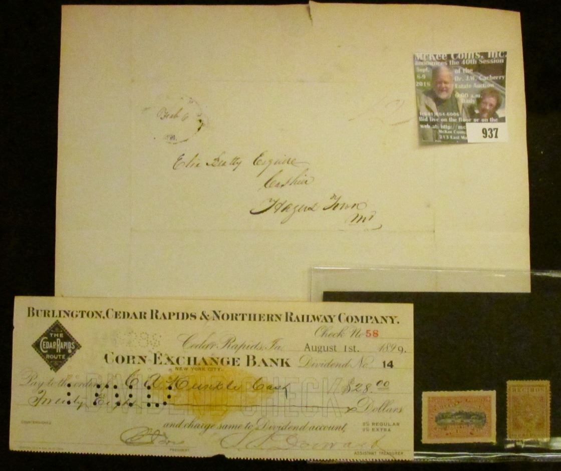 937 _ Feb 6th, 1836 Folded letter with Postal Stamp; 1899 Check with Gold Documentary Stamp "Burling