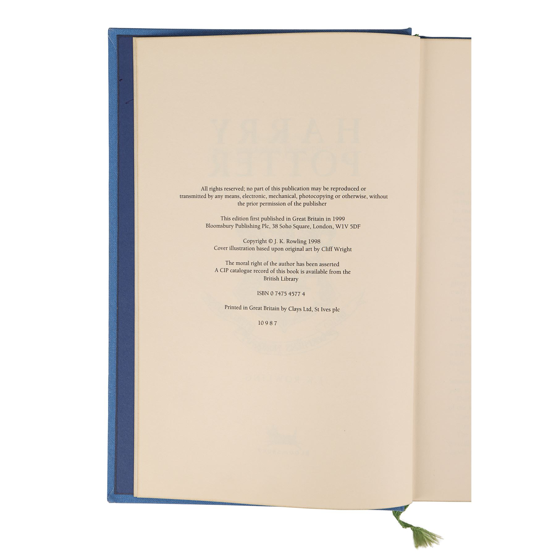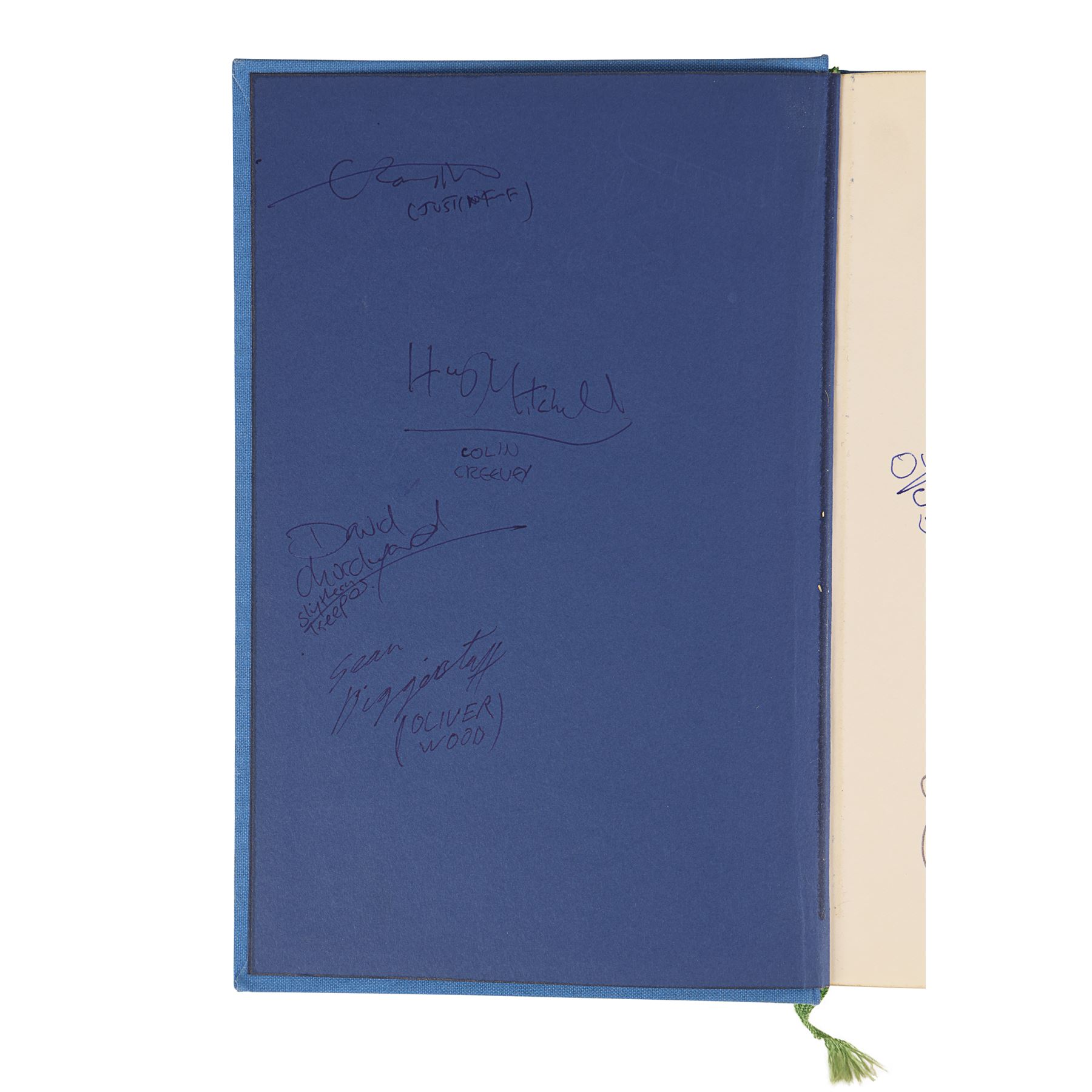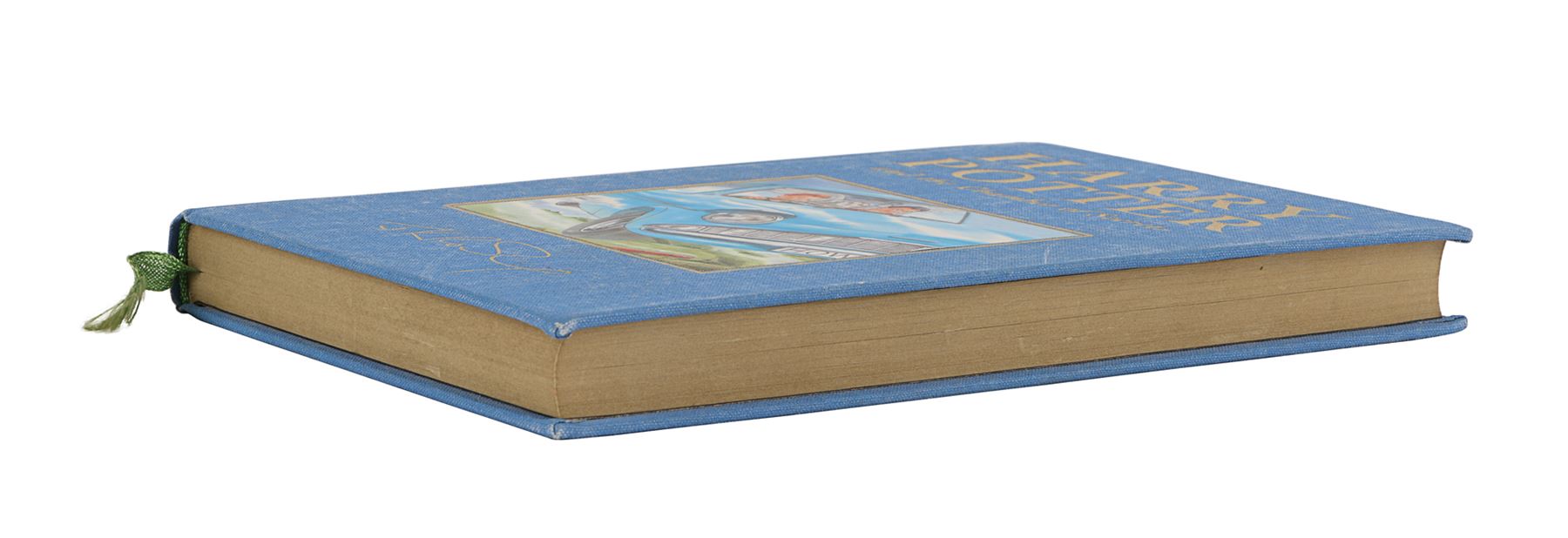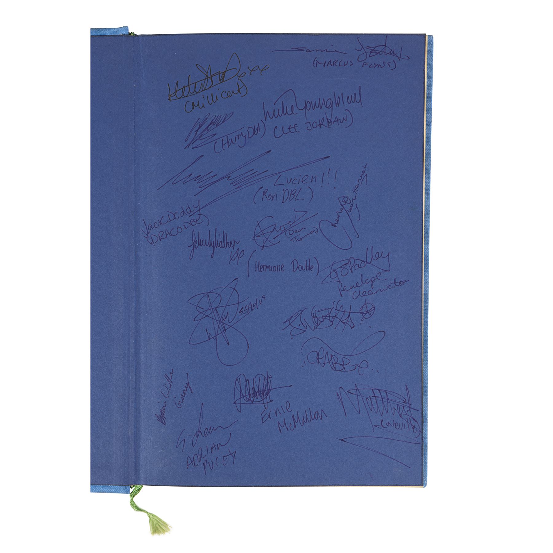 The book has been autographed in blue and black ink by cast members and body doubles on the inside of the front cover, the title page, and the last page. Daniel Radcliffe (Harry Potter), Emma Watson (Hermione Granger), Rupert Grint (Ron Weasley), and Tom Felton (Draco Malfoy) have signed the book on the title page. Dimensions: 9.5" x 6.25" x 1" (24.25 cm x 16 cm x 2.5 cm)