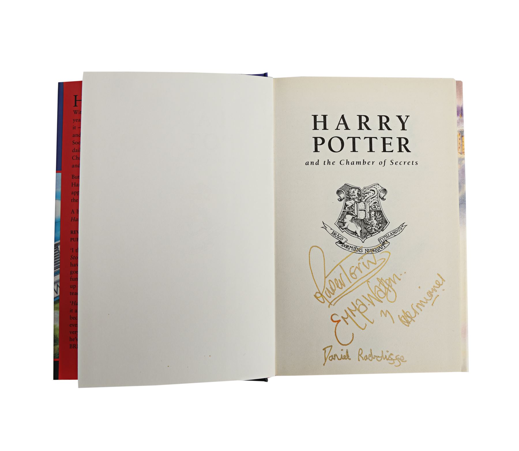 The book, a hardback copy of J.K. Rowling's Harry Potter and the Chamber of Secrets, has been autographed in gold ink on the title page by three of the leading cast members: Daniel Radcliffe, who plays Harry Potter, Rupert Grint, who plays Ron Weasley, and Emma Watson, who plays Hermione Granger. Emma Watson has written her character's name beneath her autograph. The name "Eddie" is written in pencil on the first page of the book. Dimensions: 8.25" x 5.5" x 1" (21 cm x 14 cm x 2.5 cm)