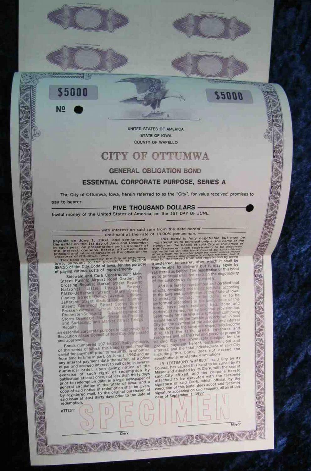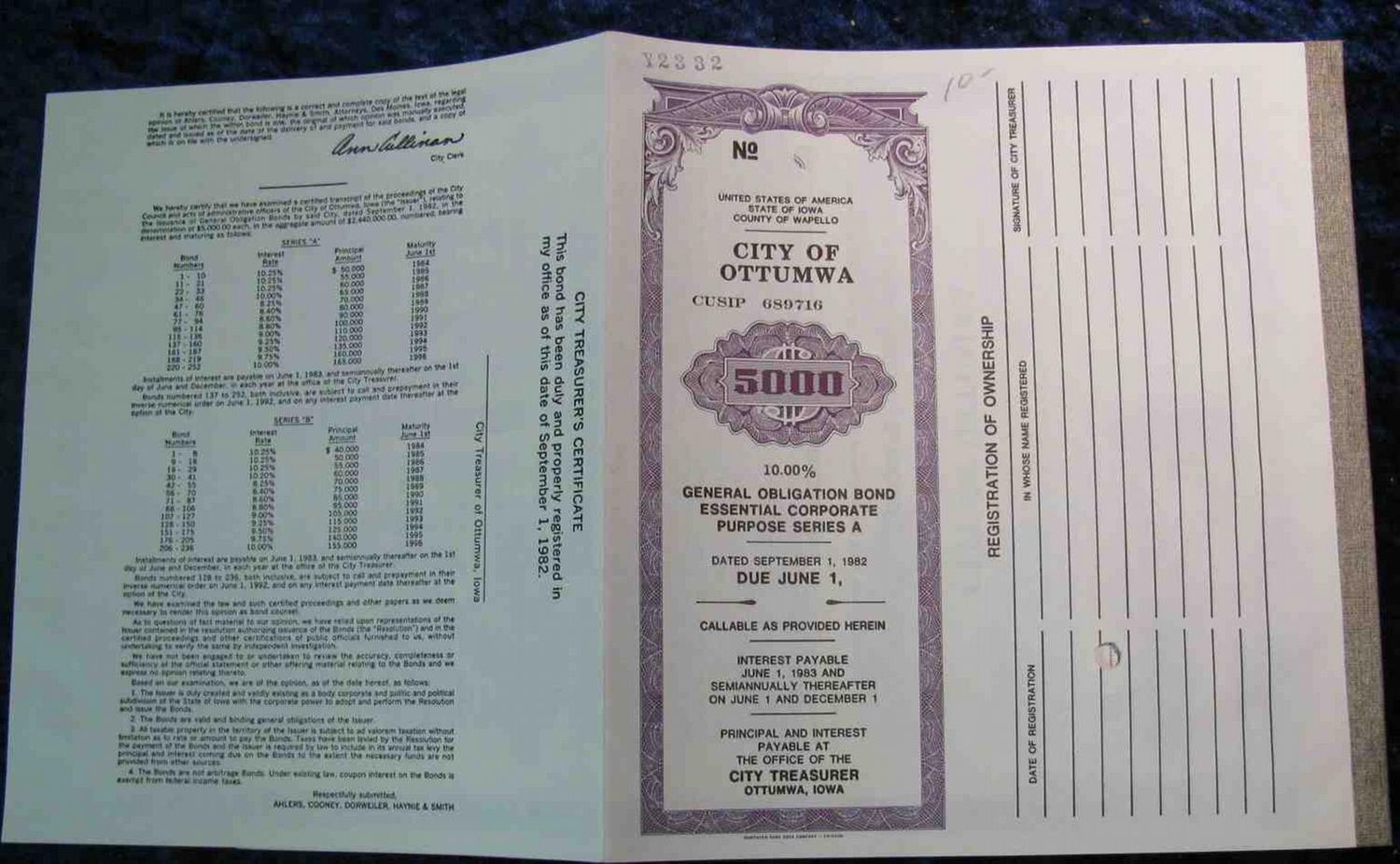 94. 1982 City of Ottumwa, Iowa General Obligation Bond $5000.00