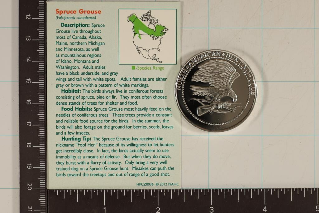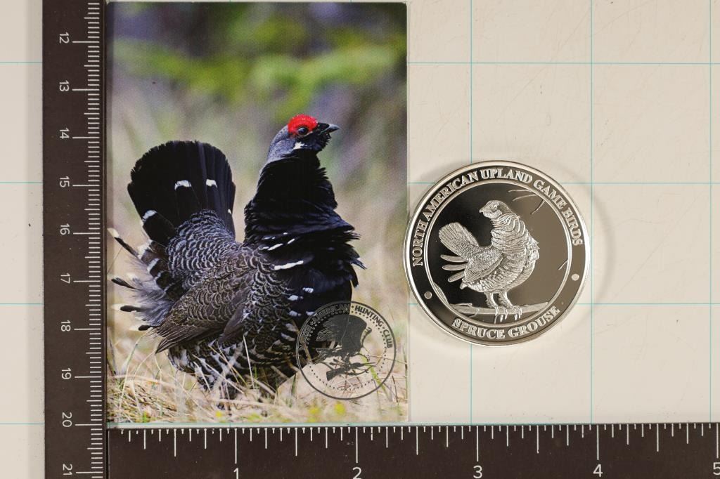 BIRDS HUNTING CLUB MEDAL. PROOF IN HARD PLASTIC CAPSULE WITH INFO CARD "SPRUCE GROUSE"
