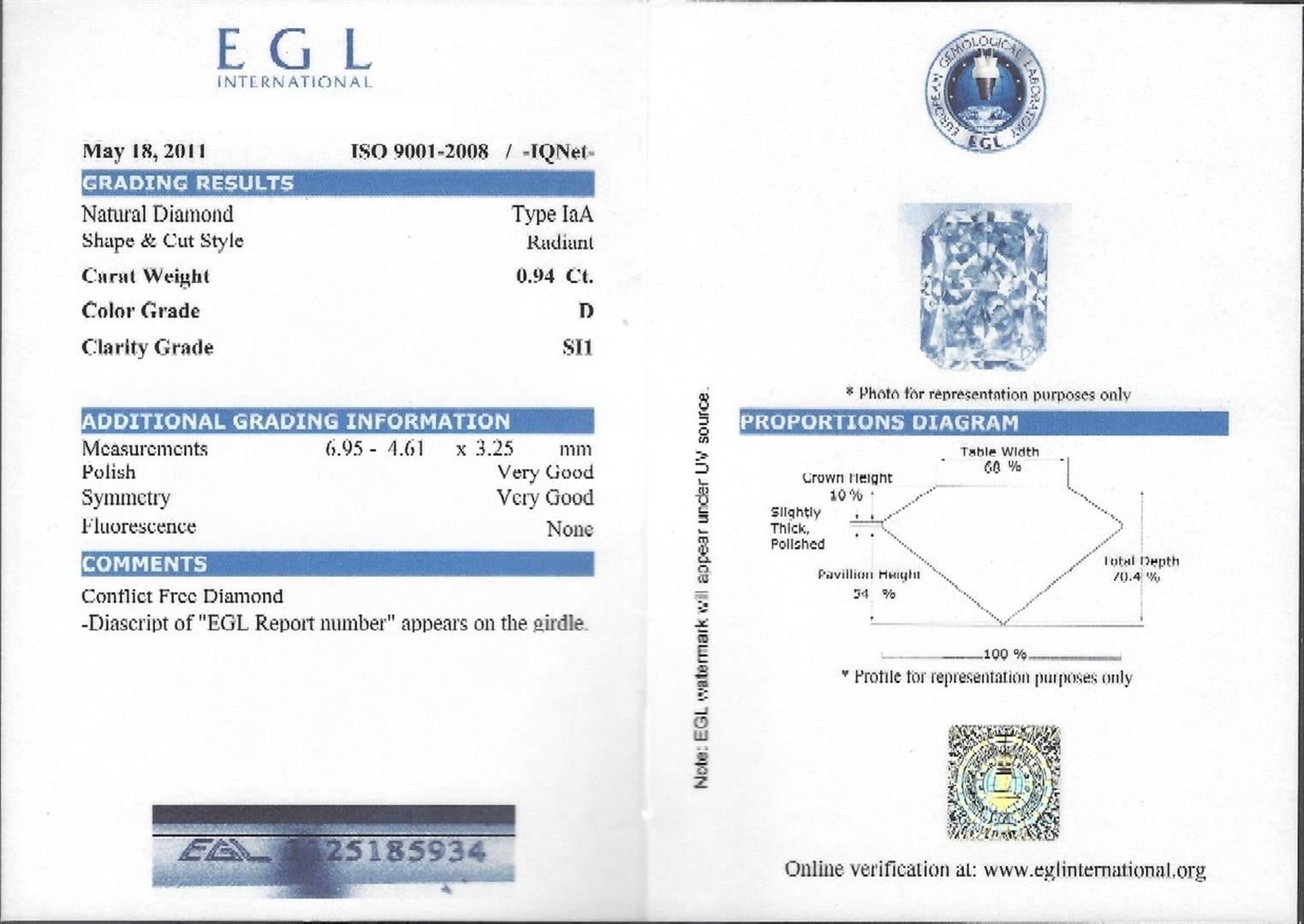 One radiant cut .94ct diamond. Condition is good. Type: IaA. Color Grade: D. Clarity Grade: SI1. Measurements: 6.95 - 4.61 x 3.25mm. Polish: Very Good. Symmetry: Very Good. Fluorescence: None. EGL INT Appraised.