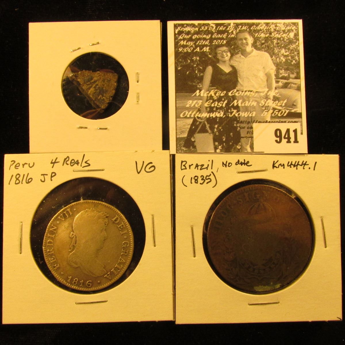 941 . 1737 Phillip V, One bit; 1816 4 Reals Peru JP VG; & Brazil 40 Reis copper (1835). (3 coins total)