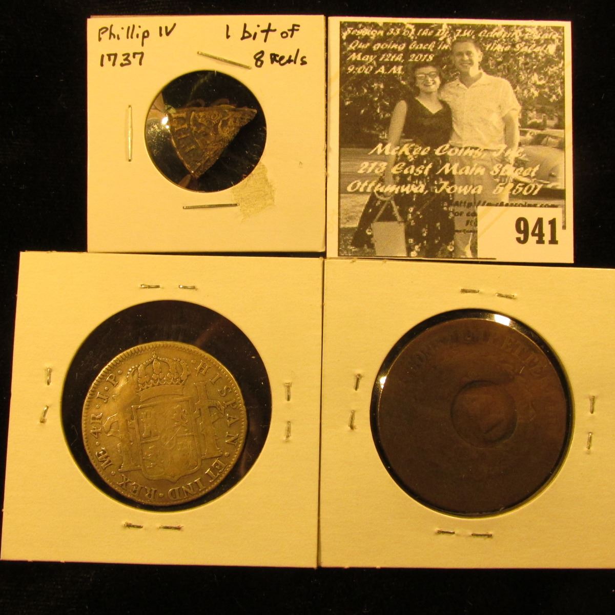 941 . 1737 Phillip V, One bit; 1816 4 Reals Peru JP VG; & Brazil 40 Reis copper (1835). (3 coins tot