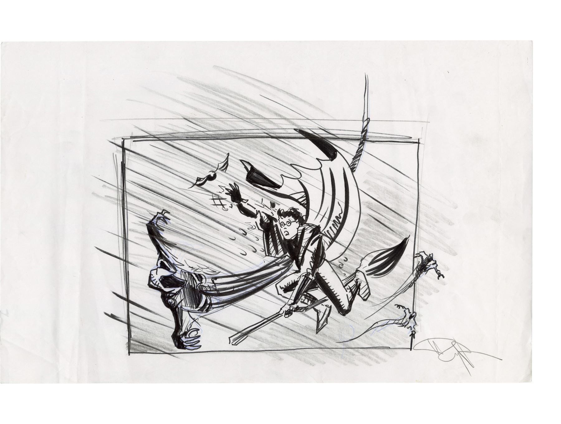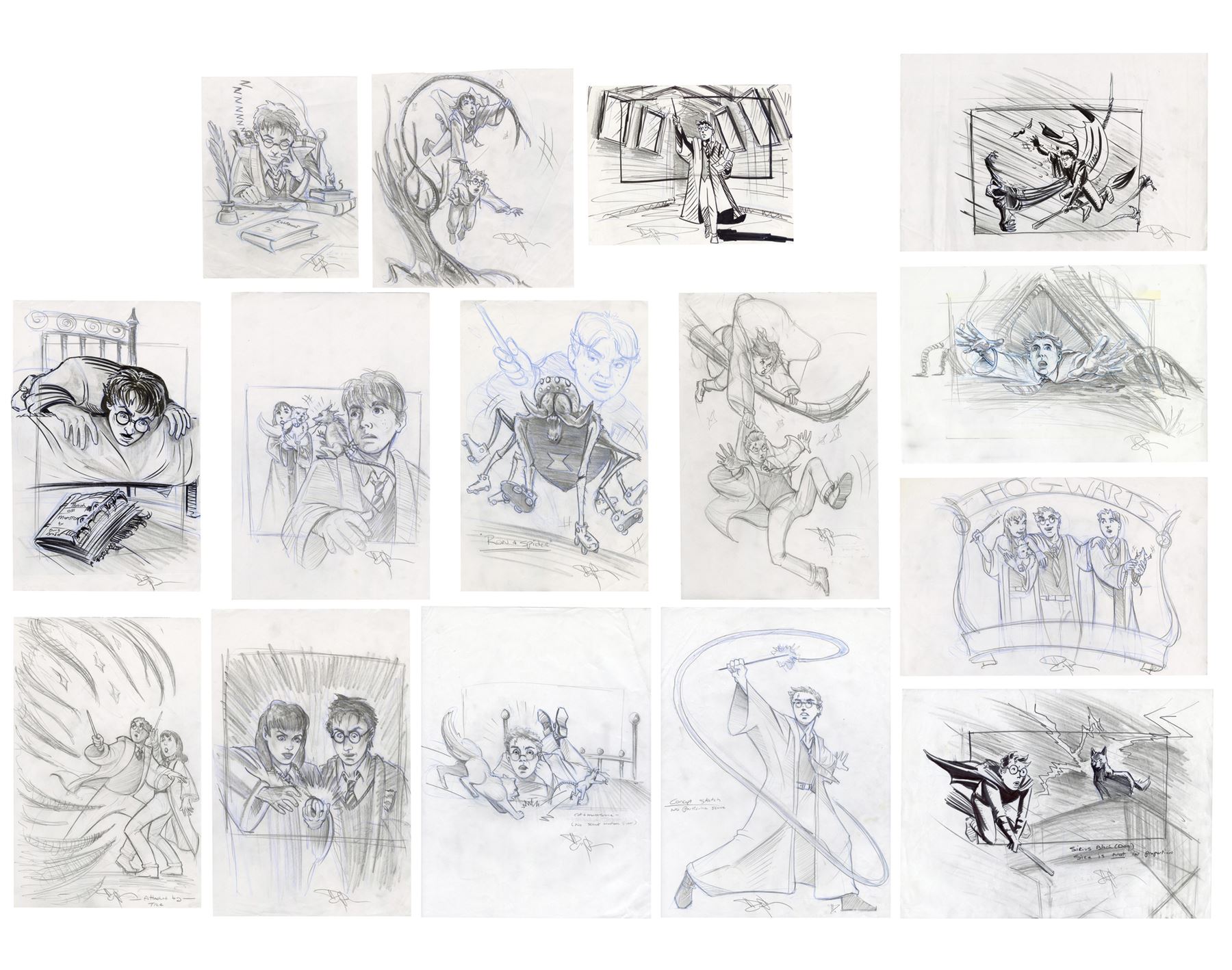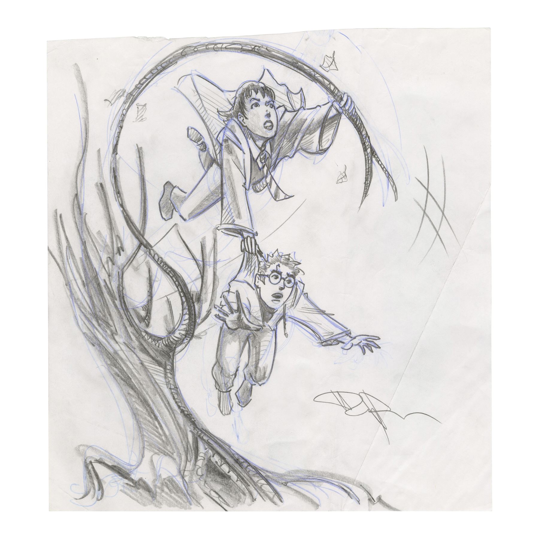 These illustrations, inspired by storyboards of the Quidditch match being besieged by Dementors, the Boggart and Whomping Willow scenes, and Hermione Granger's (Emma Watson) Time-Turner are rendered in graphite and blue colored pencil on drawing paper, all signed by Brode. Associated scene details such as "Cat and Mouse scene," "Attacked by Tree," and "Ron & Spider" are hand-marked in pencil outside the borders. The set exhibits mild smudging and bent corners throughout. Dimensions: (each) 11" x 17" (28 cm x 43.25 cm)