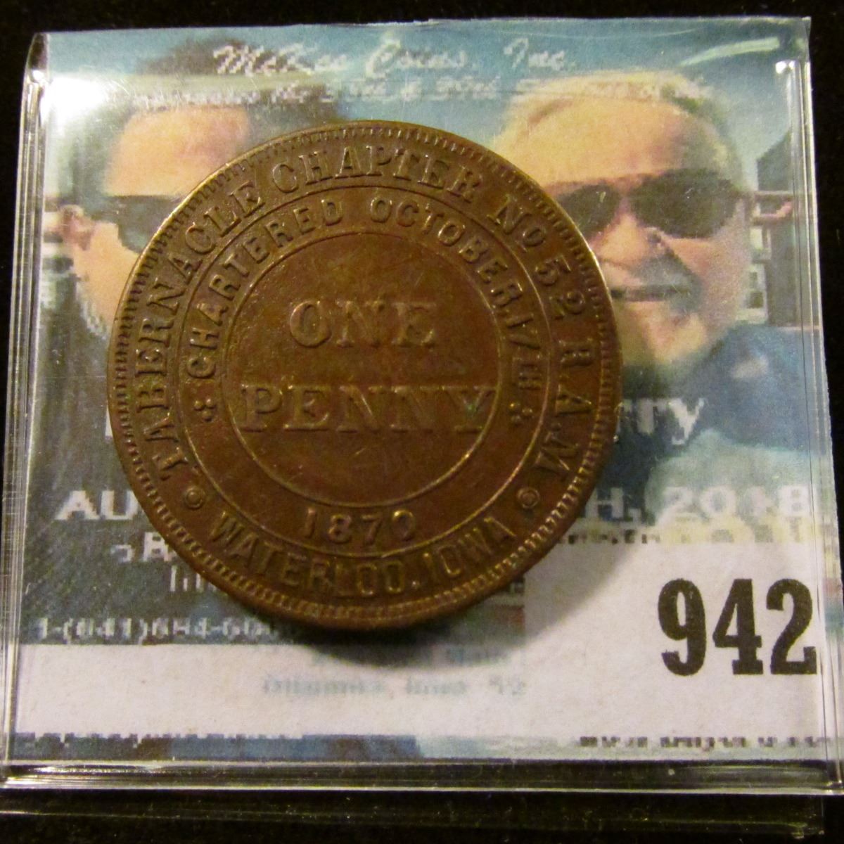 942 _ "Tabernacle Chapter No. 52 R.A.M./Chartered October 17th/1870/One/PennyWaterloo, Iowa", "KSHTW