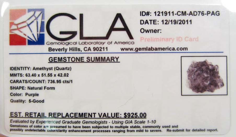 9427 - HUGE 736.95 CT AMETHYST QUARTZ W/ GLA APPRAISAL OF $925