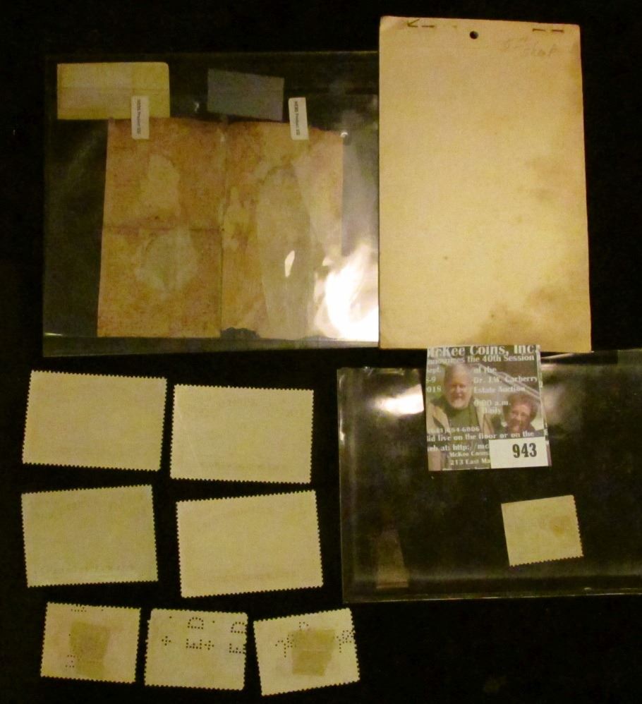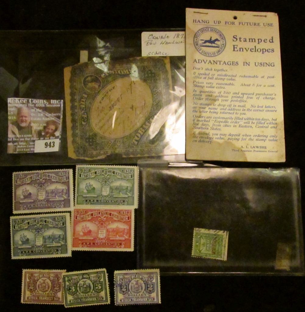 "Post Office Department United States of America Stamped Envelopes…" Order Blank forms; Four-piece Set "1930 National Philatelic Exhibition A.P.S. Convention" Stamps; 1875 Canada Customs Tobacco Stamp (hand numbered and dated); "B & O Commutation" Stamp; & $3 State of New York Stock Transfer Stamp.