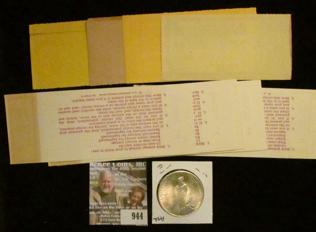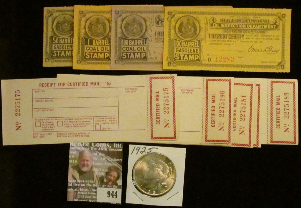 Group of unused "Receipt For Certified Mail---15c"; Four Piece Set of 1909 State of Missouri Gas & Oil Stamps, mint condition; & 1925 P U.S. Peace Silver Dollar in Gem BU.