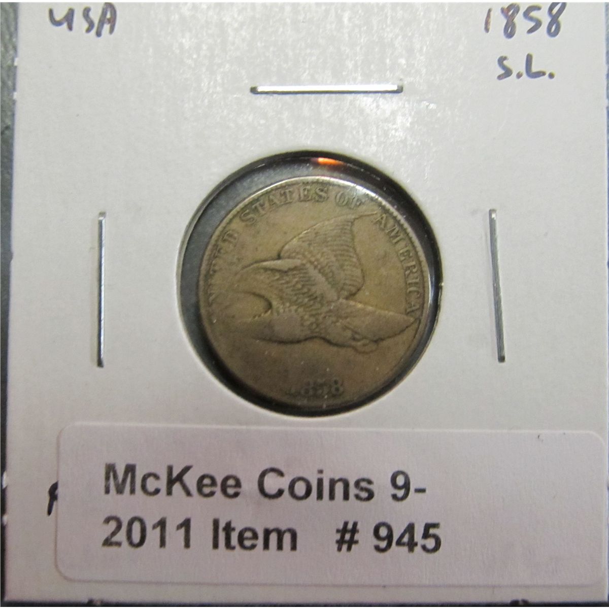 945. 1858 SL U.S. Flying Eagle Cent. VF 30. "UNITED" and Eagle's head are weakly struck-possible grease-filled die of planchet.