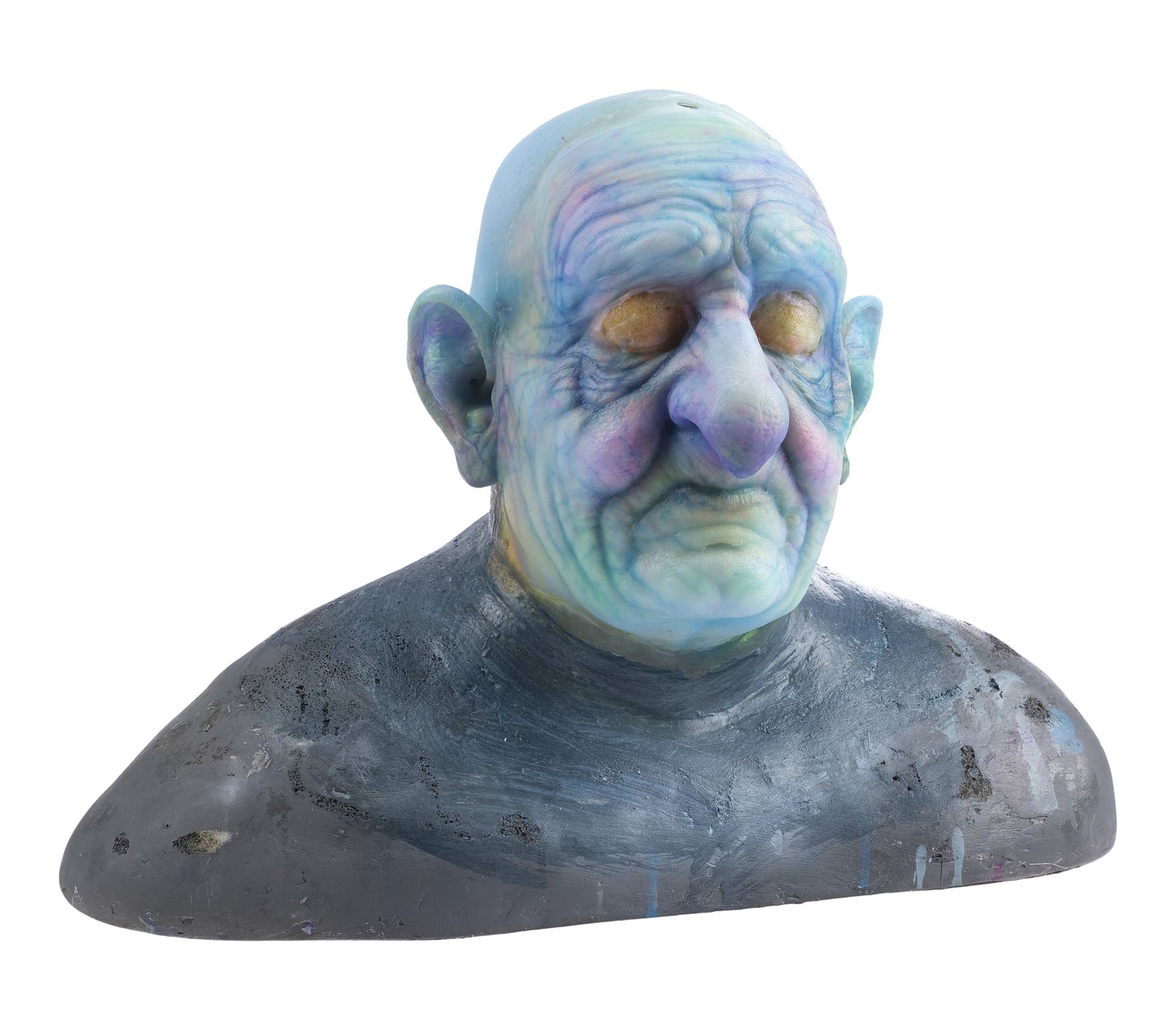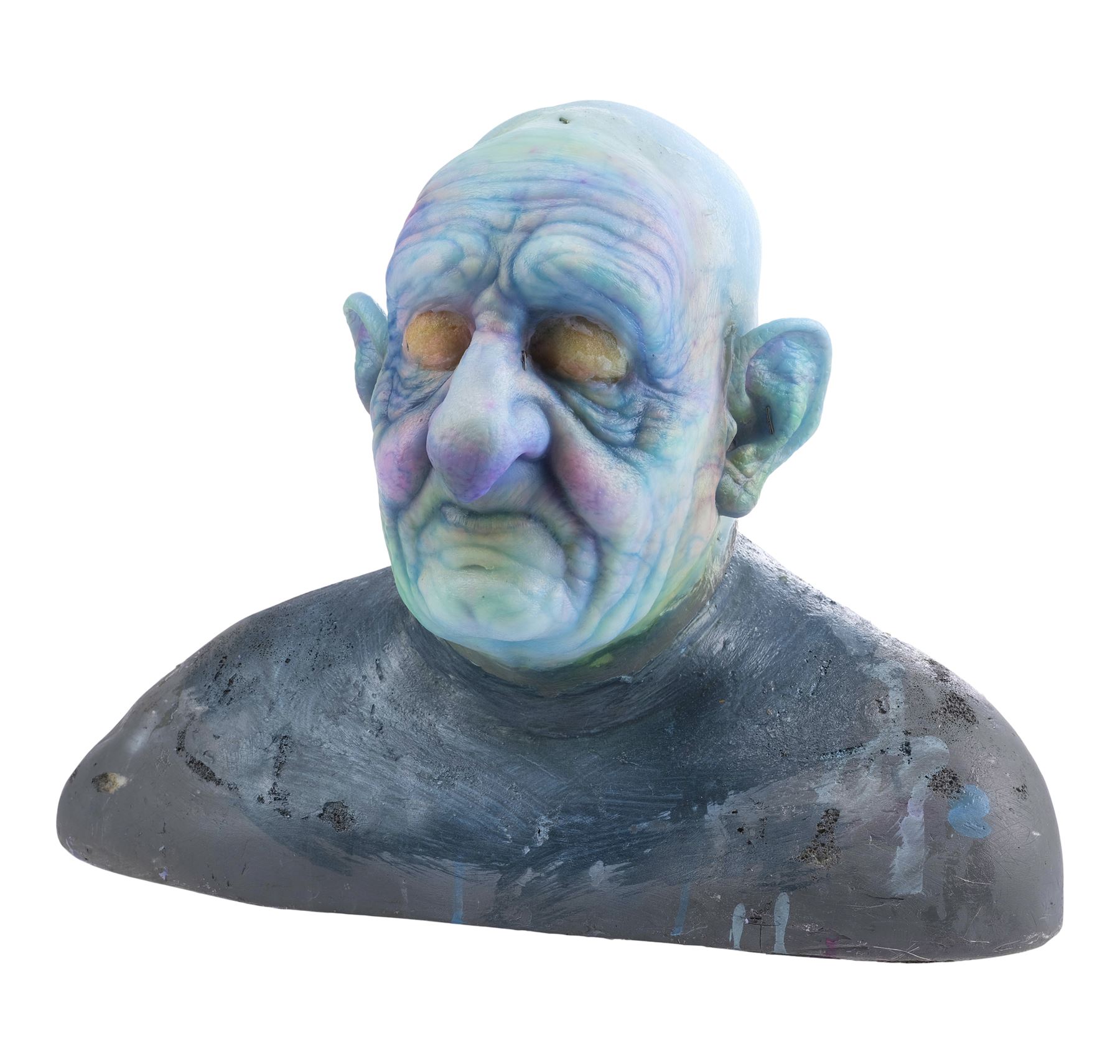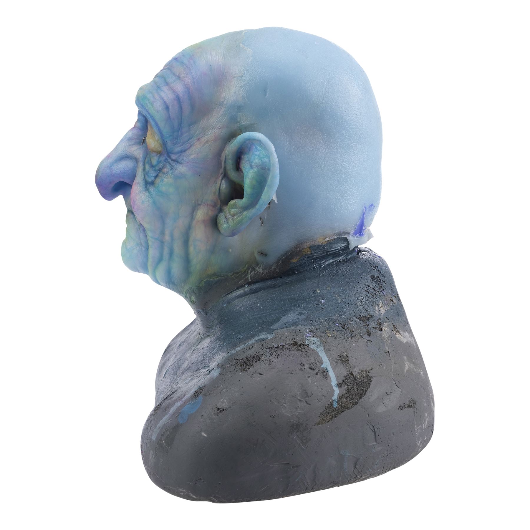 This highly detailed makeup appliance consists of a silicone face, cowl, and ears. It features lifelike skin texture and expertly sculpted wrinkles hand-painted ghostly shades of blue, yellow and purple. It comes mounted to a foam bust painted black and held in place with T-pins. This lot exhibits ripped silicone around the ears and neck, and blue residue at the back of the head. Dimensions: 21.5" x 13.5" x 16" (54.5 cm x 34.25 cm x 40.5 cm)