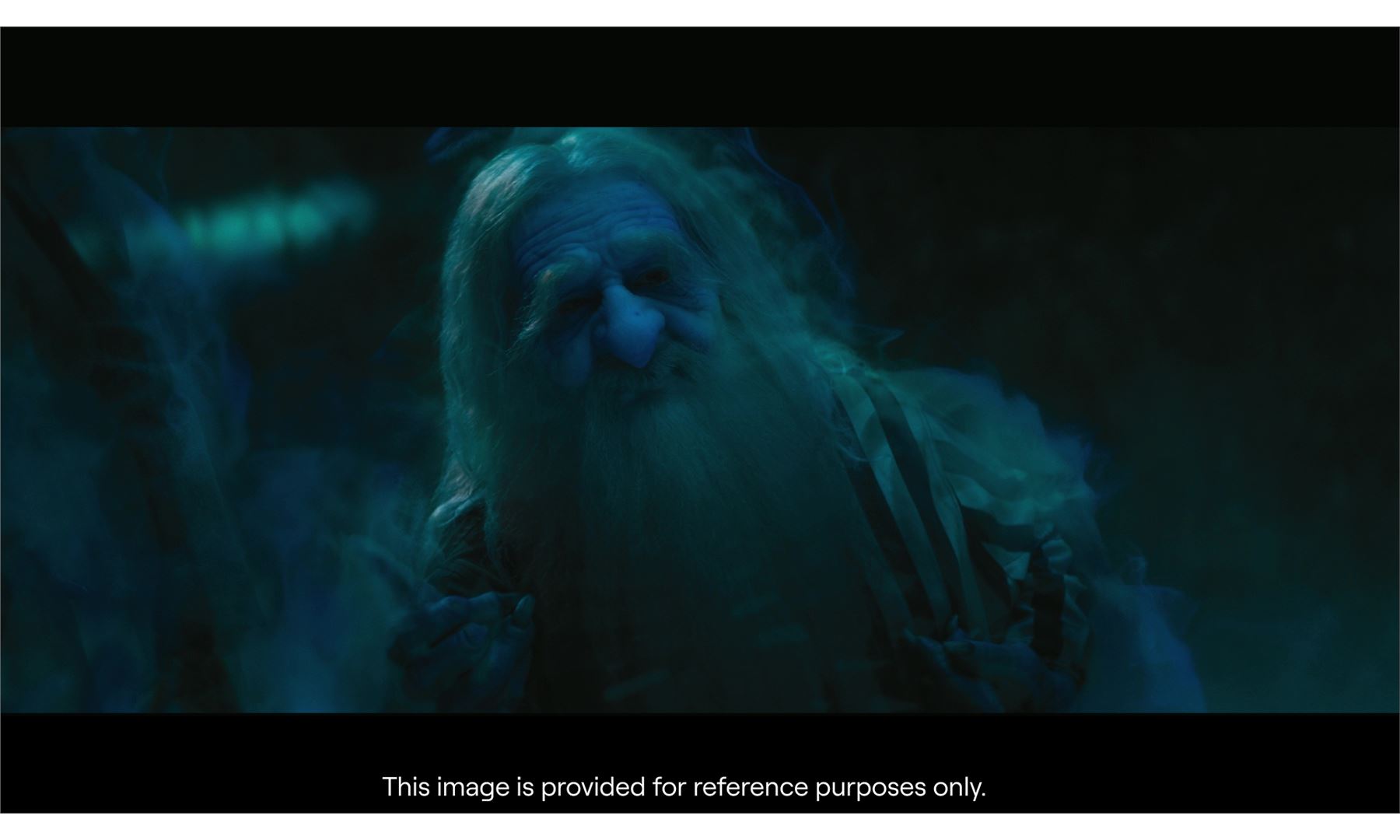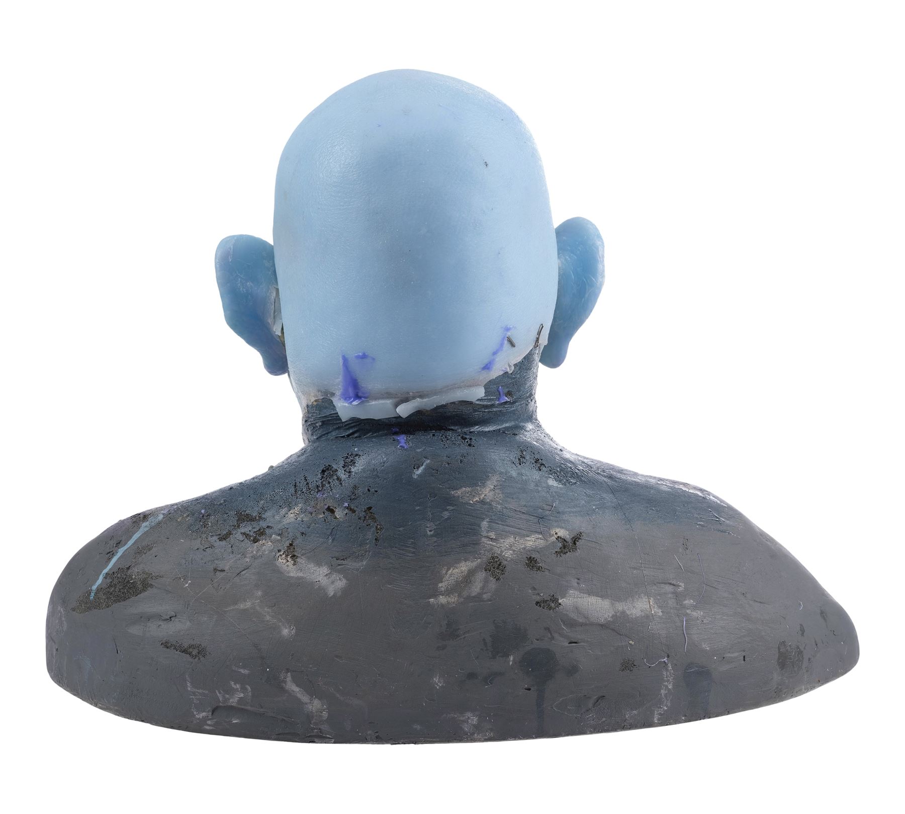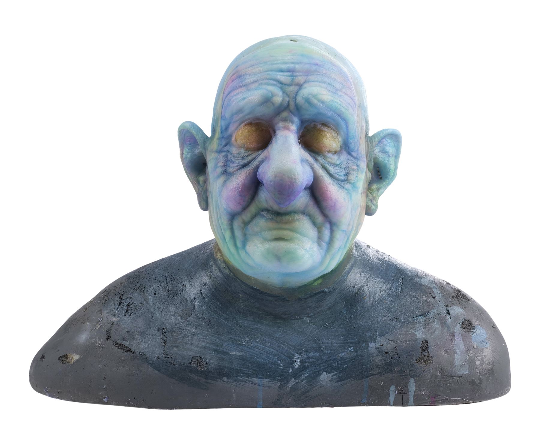 This highly detailed makeup appliance consists of a silicone face, cowl, and ears. It features lifelike skin texture and expertly sculpted wrinkles hand-painted ghostly shades of blue, yellow and purple. It comes mounted to a foam bust painted black and held in place with T-pins. This lot exhibits ripped silicone around the ears and neck, and blue residue at the back of the head. Dimensions: 21.5" x 13.5" x 16" (54.5 cm x 34.25 cm x 40.5 cm)