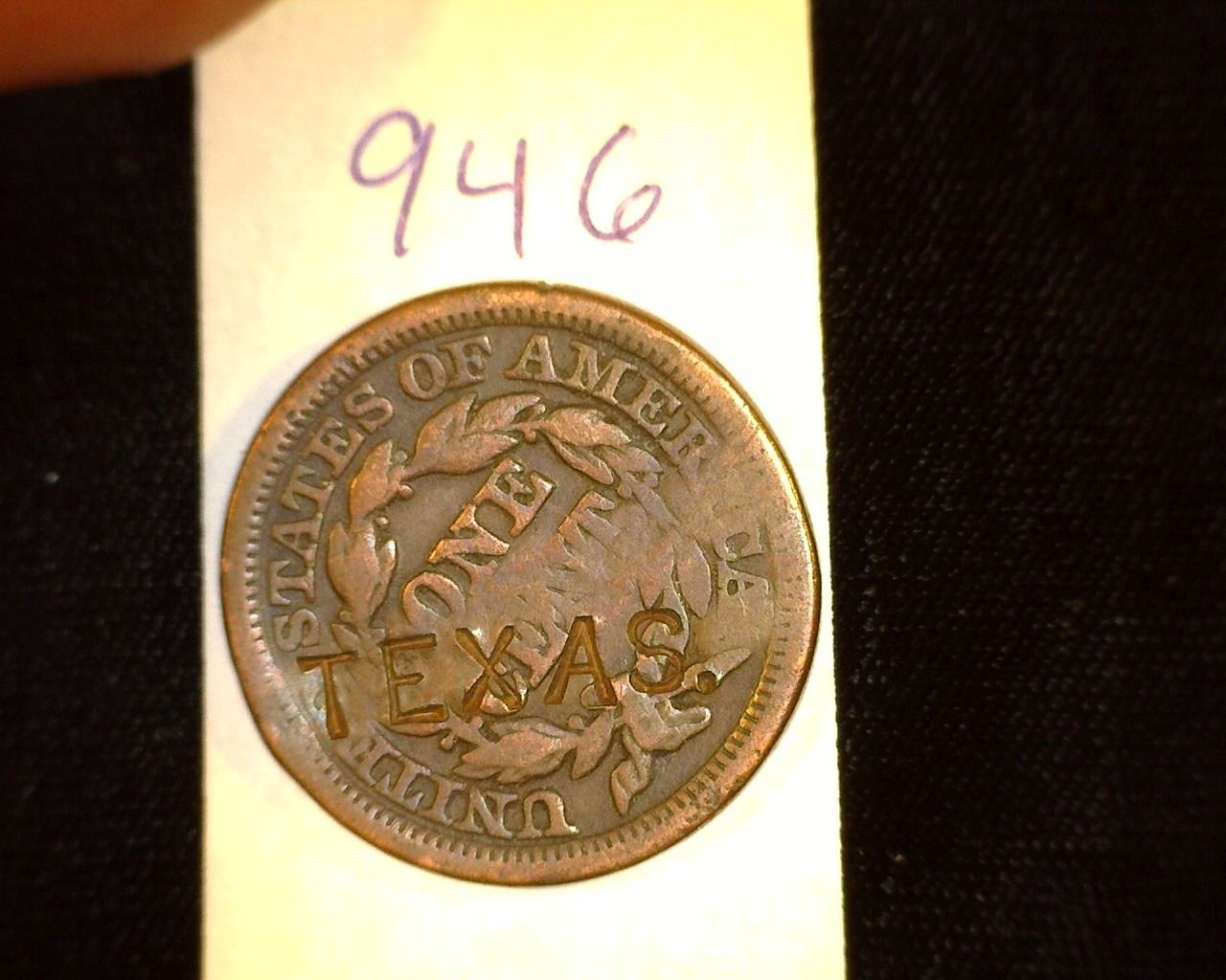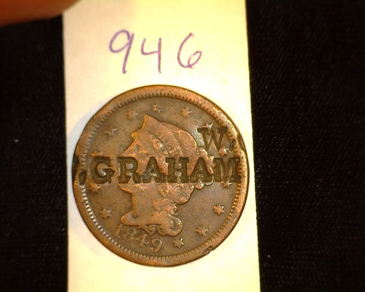 946.1849 US Large Cent Counter marked Obv. "WGraham" Rev. "Texas".