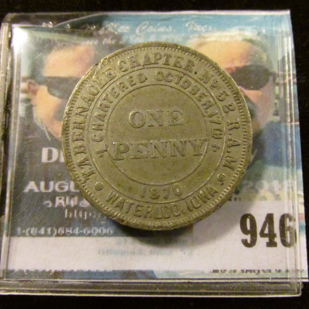 946 _ "Tabernacle Chapter No. 52 R.A.M./Chartered October 17th/1870/One/PennyWaterloo, Iowa", "KSHTW