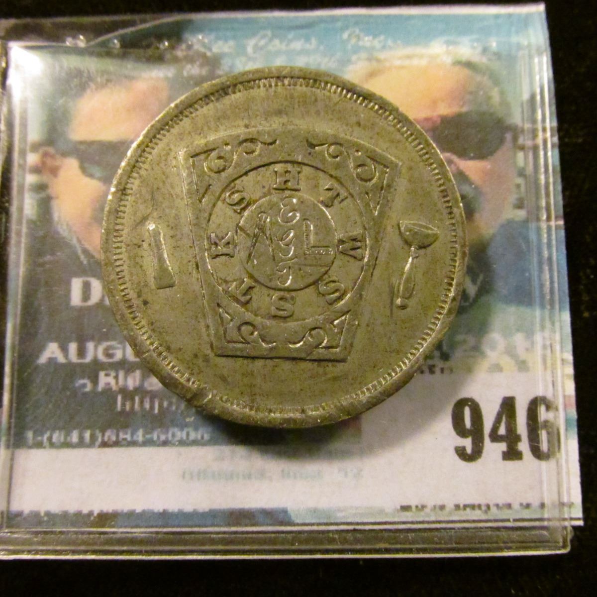 "Tabernacle Chapter No. 52 R.A.M./Chartered October 17th/1870/One/PennyWaterloo, Iowa", "KSHTWSST", white metal, personalized ith reverse initials, white metal. VF-EF.