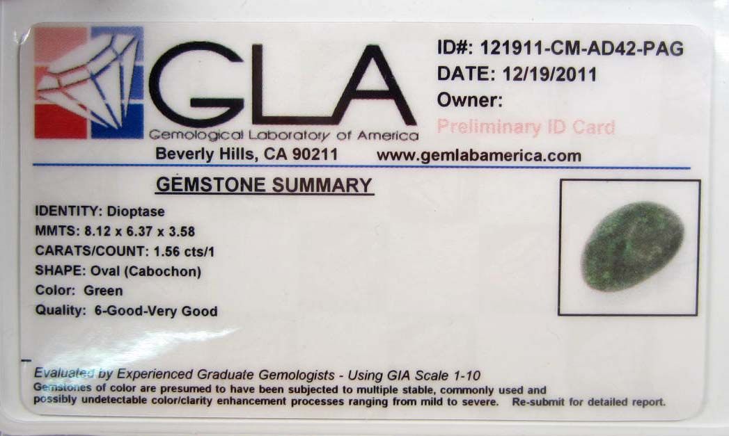 9465 - 1.56 CT. NATURAL NEON GREEN DIOPTASE W/ GLA GEM QUALITY APPRAISAL