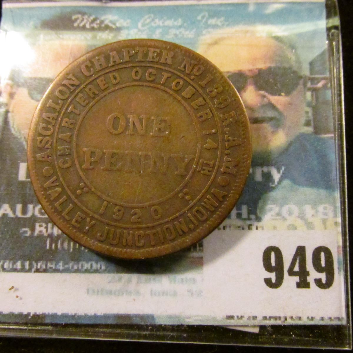949 _ "Ascalon Chapter No. 139 R.A.M./Chartered/October 14th/1920/One/Penny/Valley Junction, Iowa",