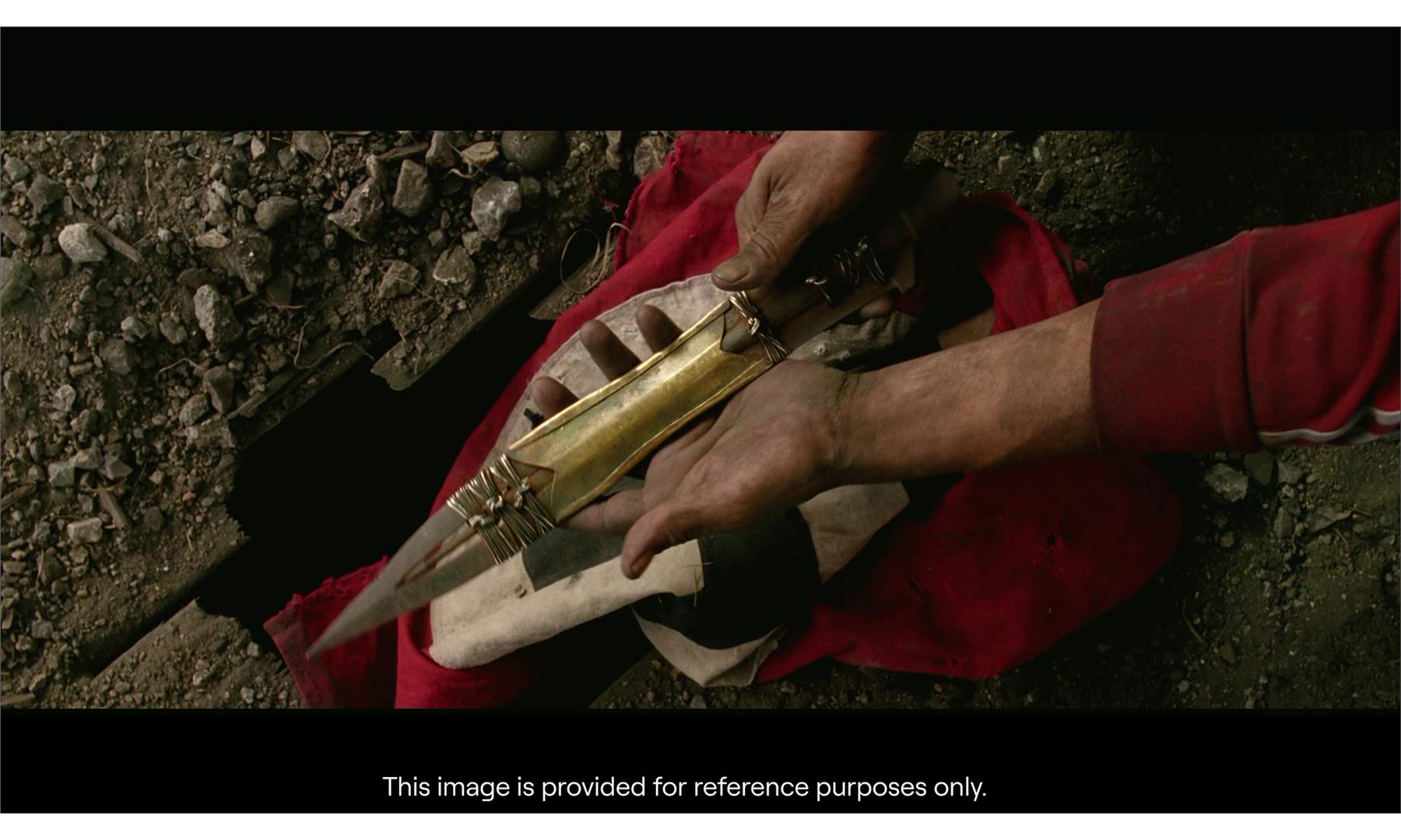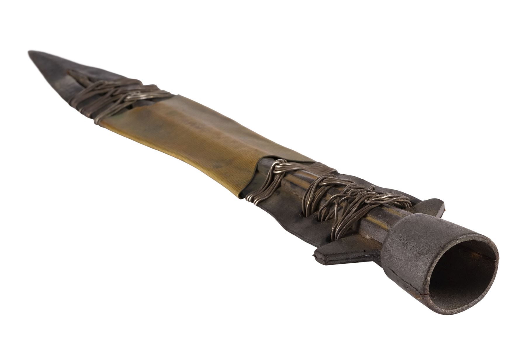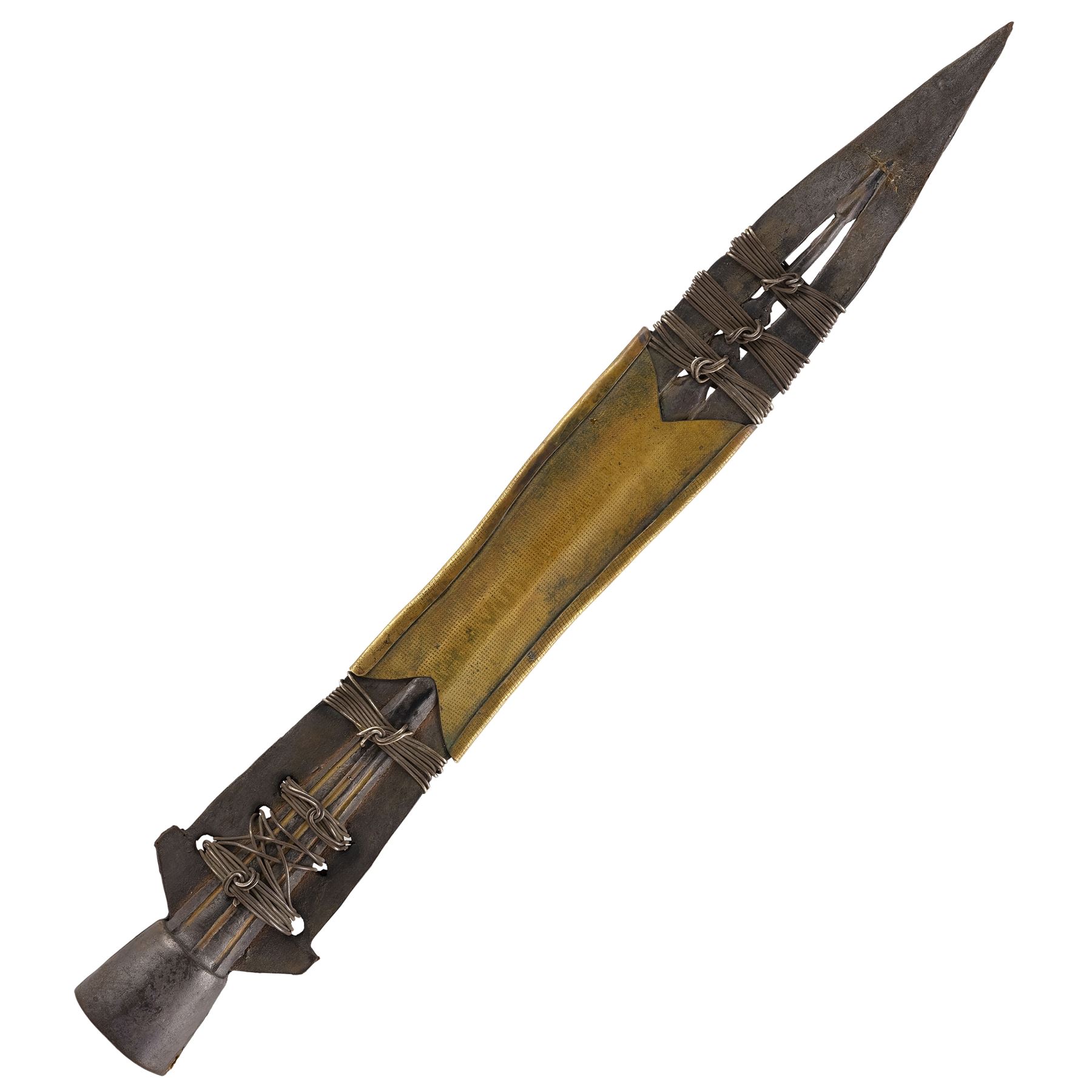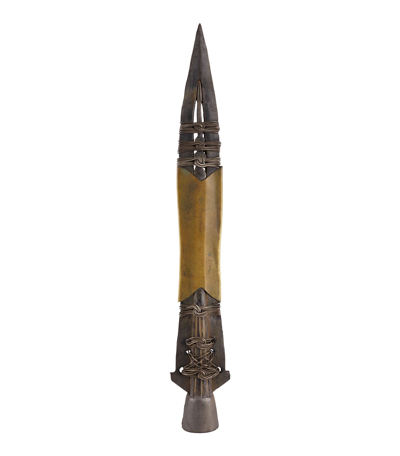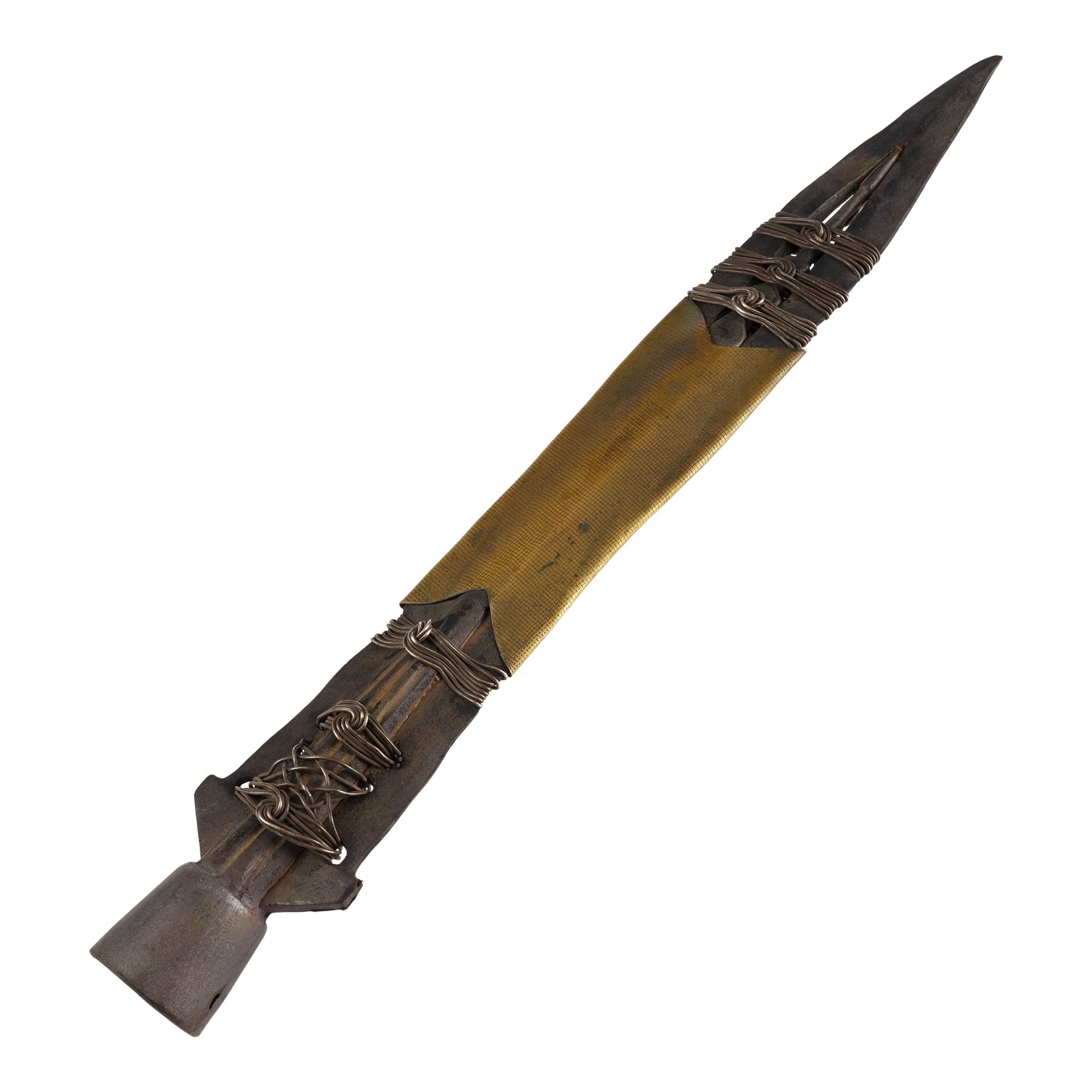 This molded rubber head originated from Warner Bros. and was originally sold with a WB Certificate of Authenticity which has since been lost. It features metal detailing at its center and around the top and bottom of the blade, which is painted silver- and gold-color to resemble steel and brass. The spearhead exhibits splitting at its base and some paint flaking, exposing the rubber beneath. Dimensions: 14.5" x 1.5" x 1.5" (37 cm x 4 cm x 4 cm)