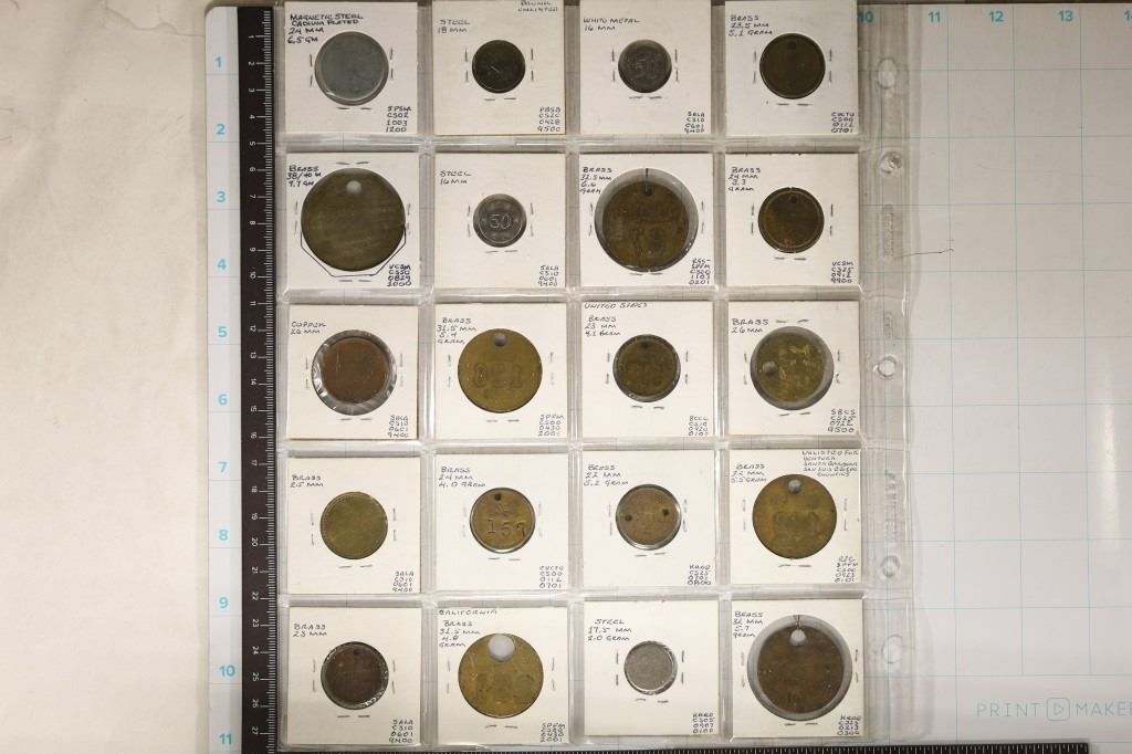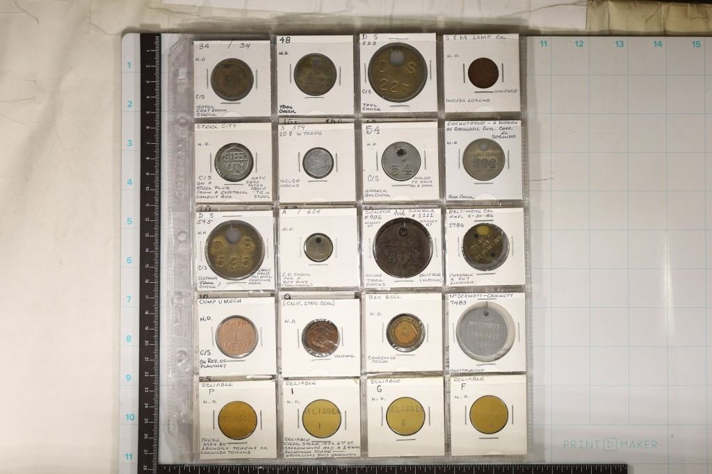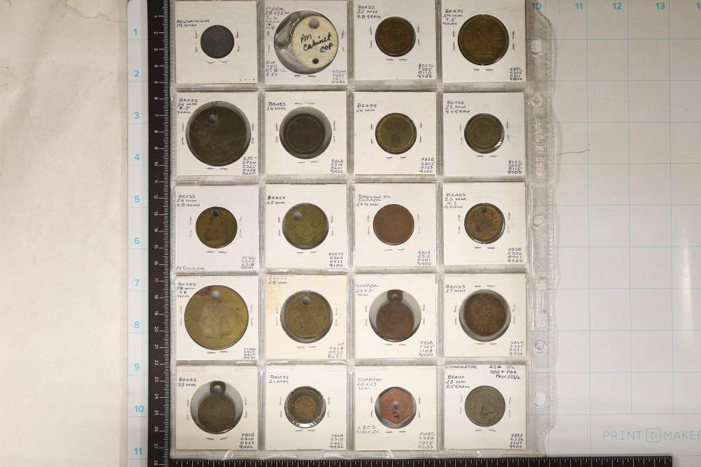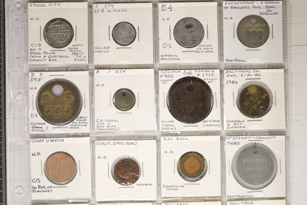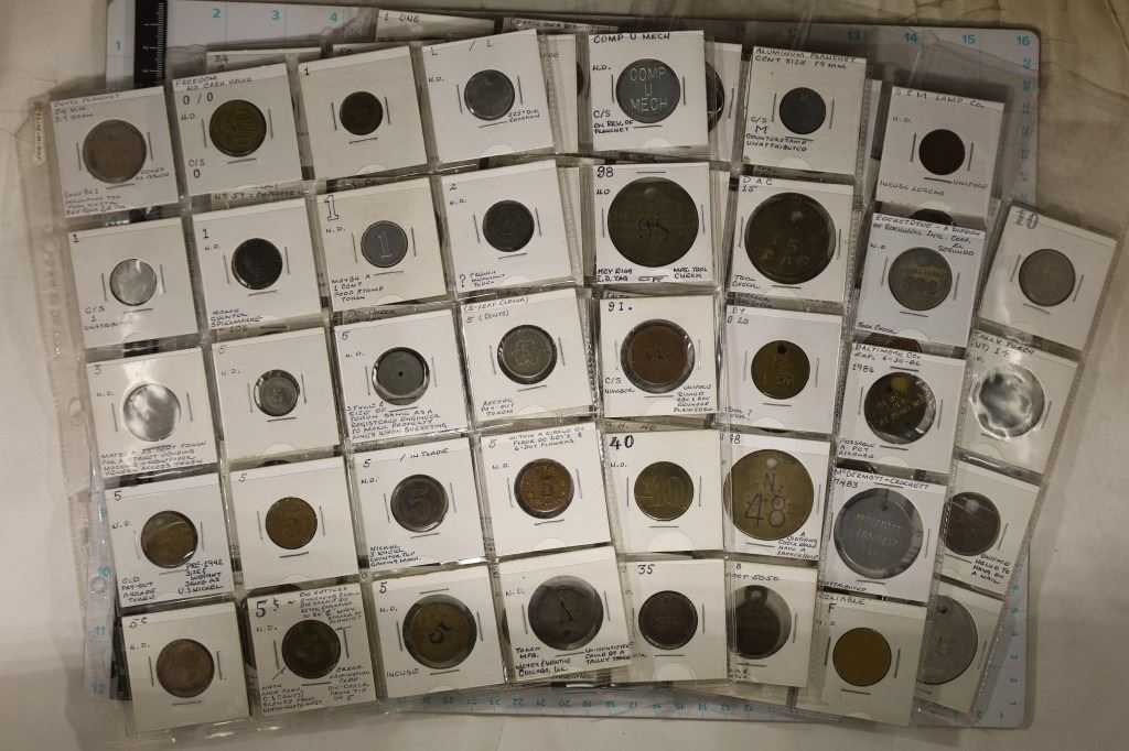 CLOTHING CHECK, PET TAG, ADVERTISING, CABINET TAG, AMUSEMENT, GOOD FOR, TIME CHECK, ARCADE, PAYOUT ETC... TOKENS. NEAT LOT OF SIZES, METALS ETC...