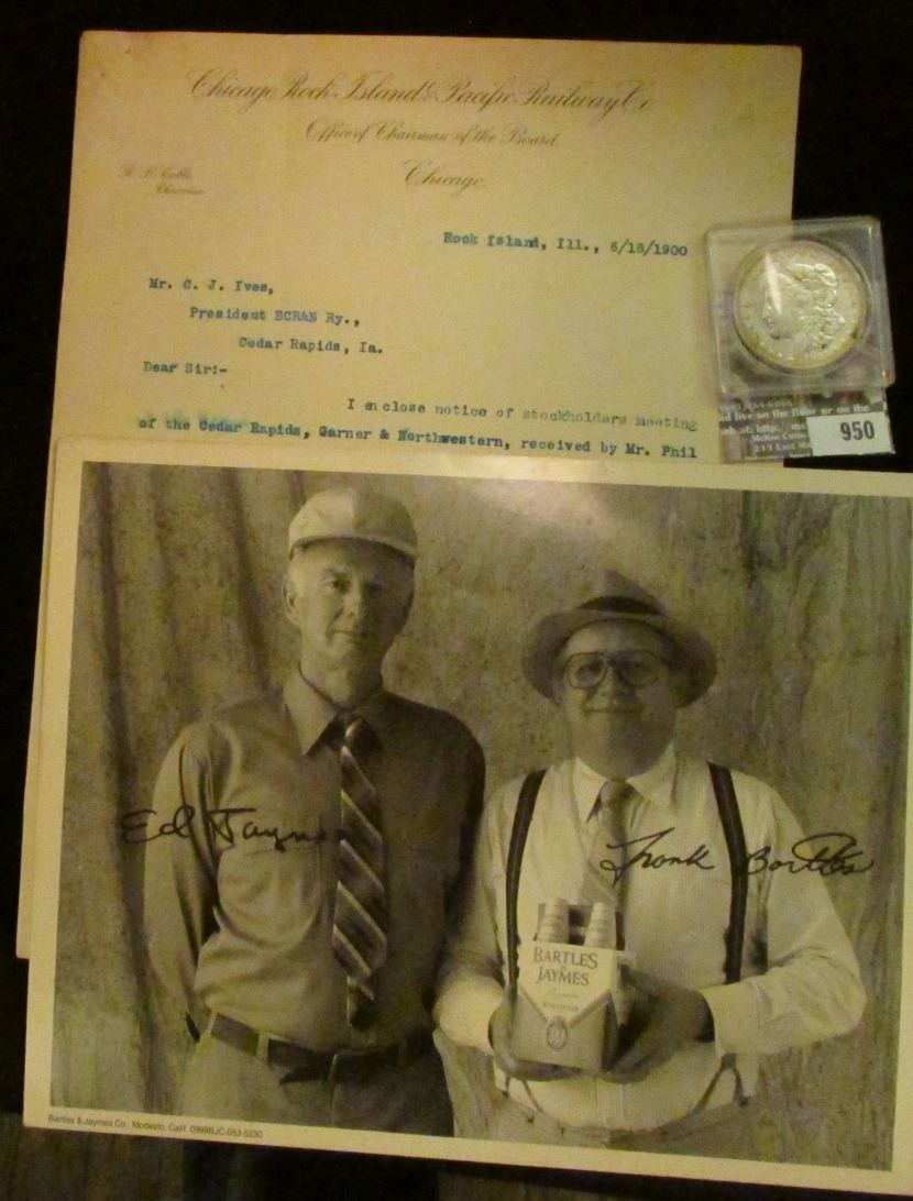"Chicago, Rock Island & Pacific Railway Co. Office of Chairman of the Board Chicago", autographed by the Chairman "R.R. Cable"; an autographed black & white photo from Bartles & Jaymes Co., Modesto, Ca.; & 1921 P U.S. Morgan Silver Dollar in a Snaptight case.